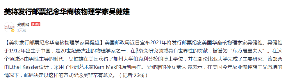 光明网 | 美将发行邮票纪念华裔核物理学家吴健雄