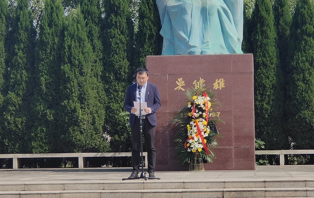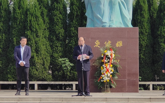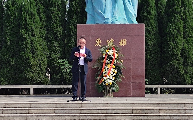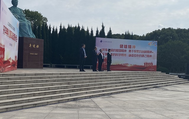 开学典礼在奏唱国歌中开始,随后由两位新生代表向吴健雄像敬献花篮,以此表达对吴健雄博士的敬意。