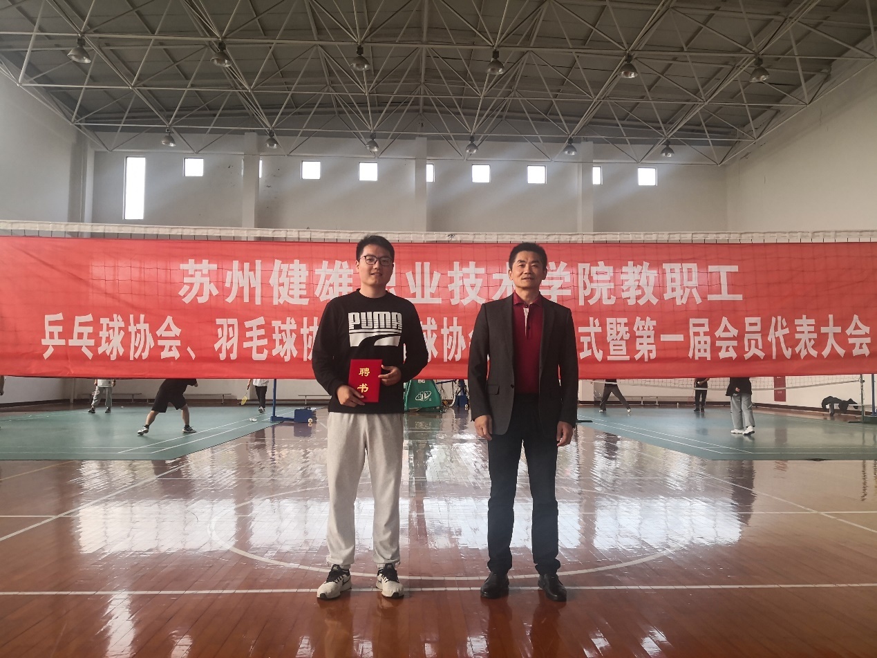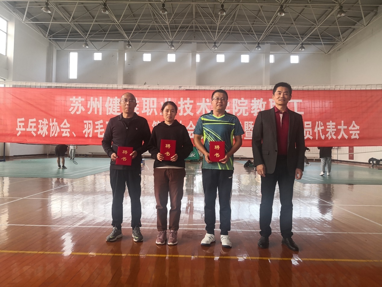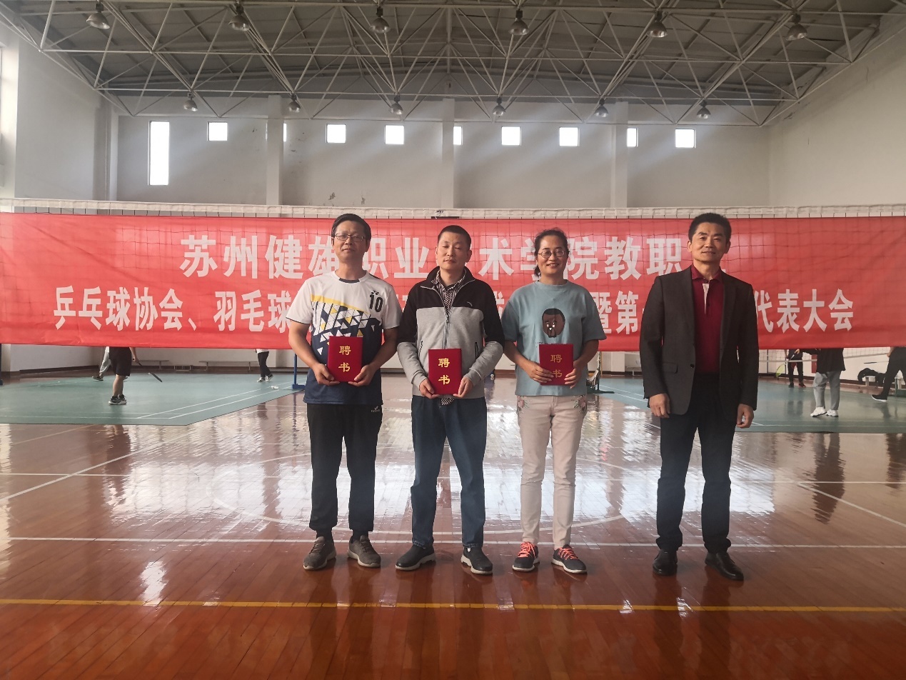 会议通过了《苏州健雄职业技术学院教职工乒乓球协会、羽毛球协会、篮球协会章程》、《苏州健雄职业技术学院教职工乒乓球协会、羽毛球协会、篮球协会管理办法》,推选产生了第一届乒乓球协会、羽毛球协会、篮球协会会长、副会长和秘书长。新当选的羽毛球协会会长李之繁老师代表会长发言。李会长表示,将充分调动广大教职工各项球类活动的热情,丰富业余生活,促进全民健身运动在学校有序开展。张学军副院长为各协会会长、副会长和秘书长颁发了聘书,并希望全体会员充分利用协会这个平台,营造学校的运动氛围,增强全民健身的意识;希望学校工会围绕各协会活动营造校园文化氛围,不断壮大协会会员队伍,切实推进全民健身运动。