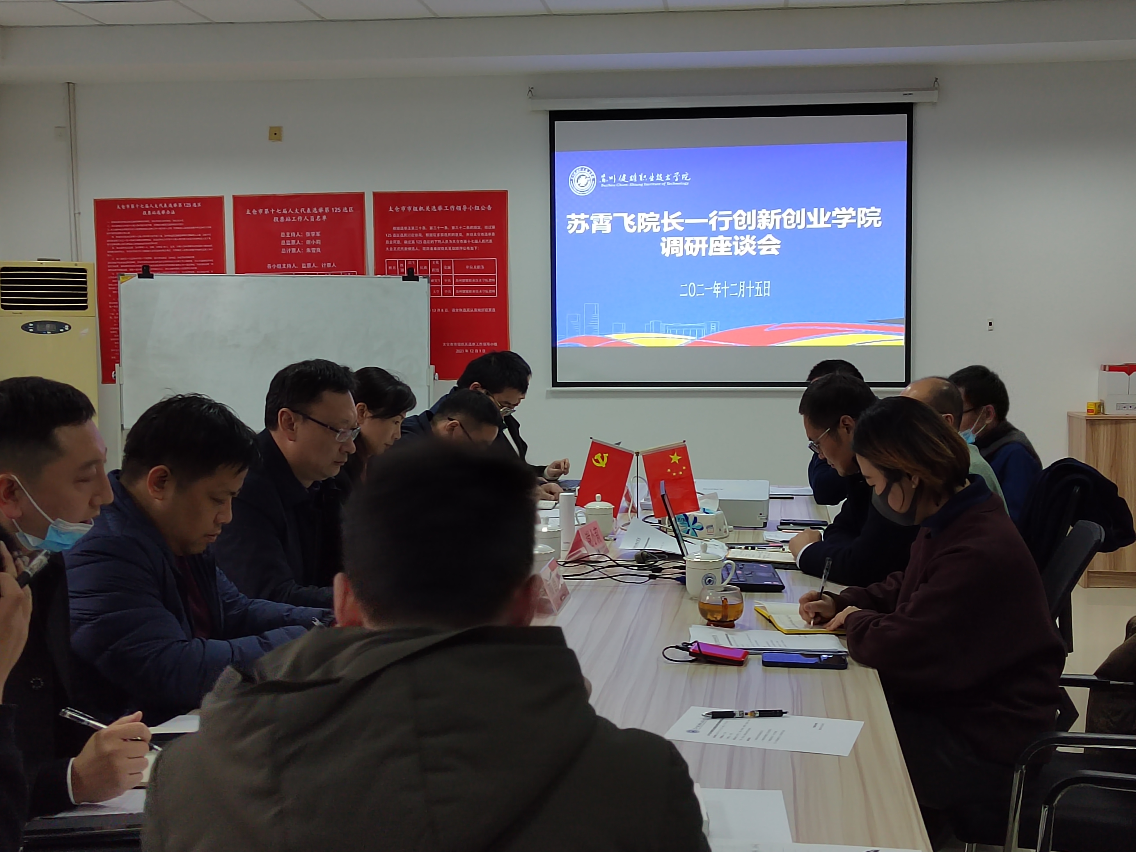 12月15日,学院党委副书记、院长苏霄飞带领党工部、人事处、教务处、学生处、合作教育处等部门负责人参加创新创业学院开展调研座谈,学院党委委员、双创学院党政负责人丁锴以及双创学院全体教职员工参加会议。