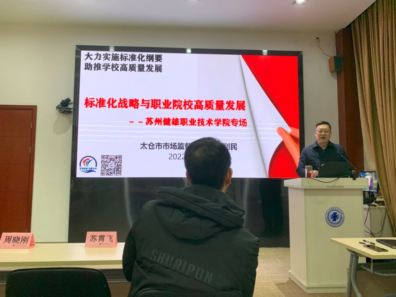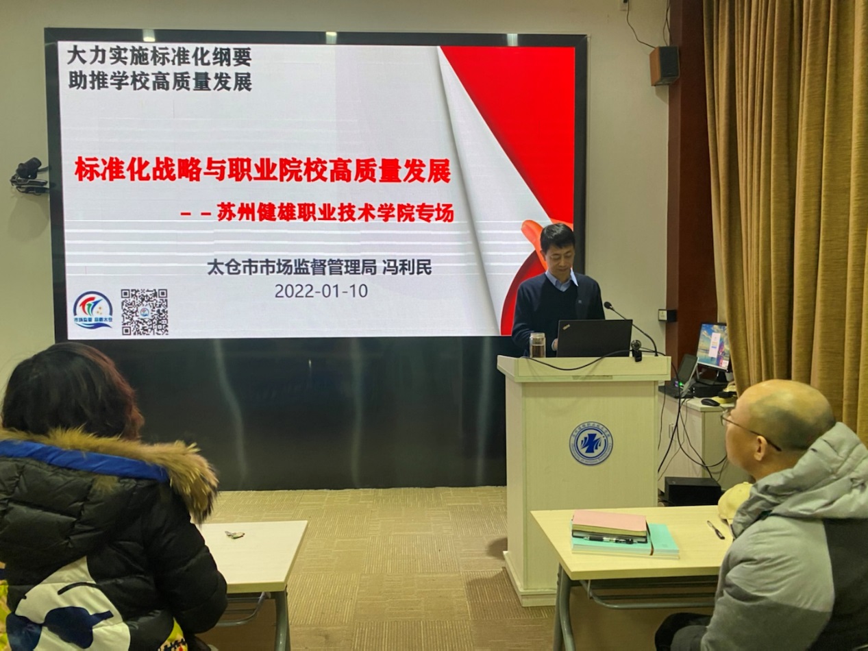 1月10日,我院邀请太仓市市场监督管理局计量与标准科科长冯利民作了题为《标准化战略与职业院校高质量发展》的专题讲座。各二级学院专业带头人、工程中心主任、课程组组长、标准化团队成员参加了讲座。党委副书记、院长苏霄飞参加活动。