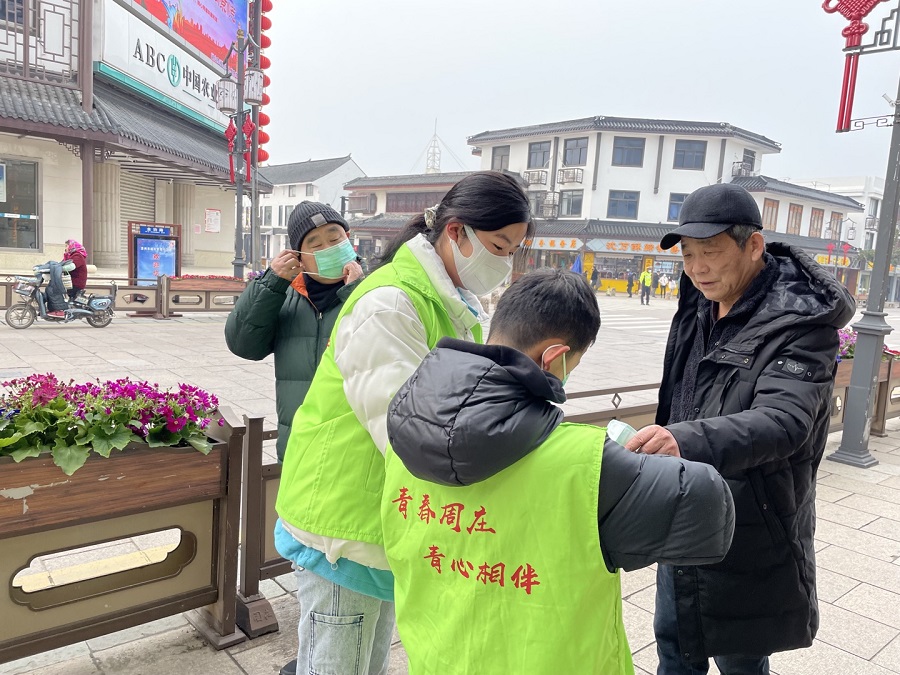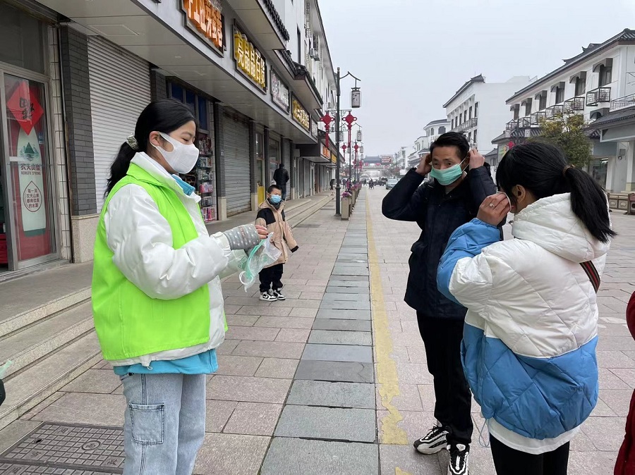 经济管理学院物流2162班的王静雨同学在她的家乡昆山周庄参加志愿服务,提醒过往行人戴好口罩,做好个人防护、消毒。她说,她一有空就去参加志愿服务,用自己的行动温暖人们的心田。