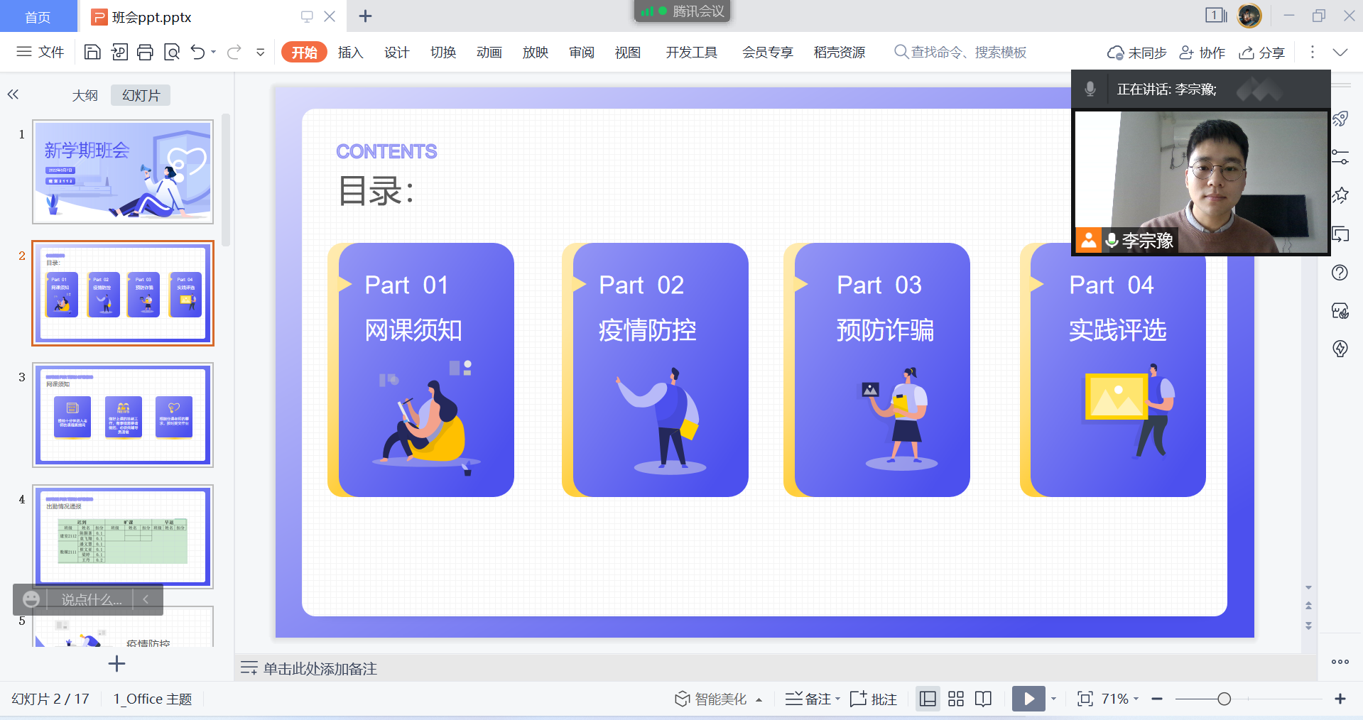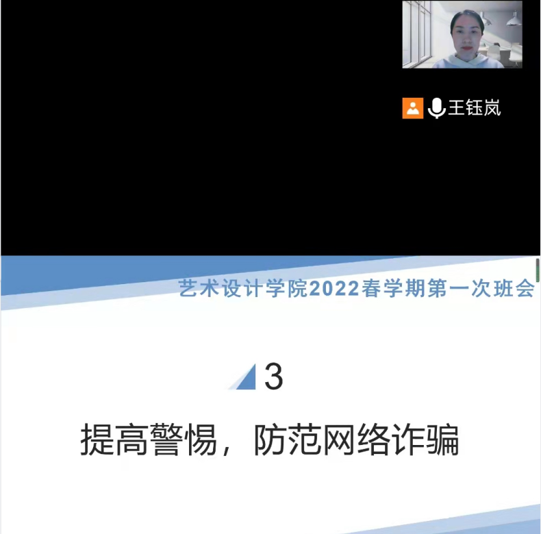 为达到线上主题班会育人效果,辅导员做了充分的前期筹备工作,如制定班会方案、制作疫情防控PPT等。此次班会围绕疫情防控、线上教学、预防诈骗、心理健康、寒假社会实践等内容开展。班主任提醒同学们要做好疫情期间的自我防护;强调疫情防控中相关要求:不得提前返校,重视健康日报,关注老师发布的各种信息;向学生普及了网络诈骗的相关案例,提醒同学们注意防范网络诈骗。此外,同学们还分享了参加寒假社会实践的经历和感受。班主任最后强调“停课不停学”,务必认真学习线上课程内容,及时完成学习任务,争做线上学习的标兵。