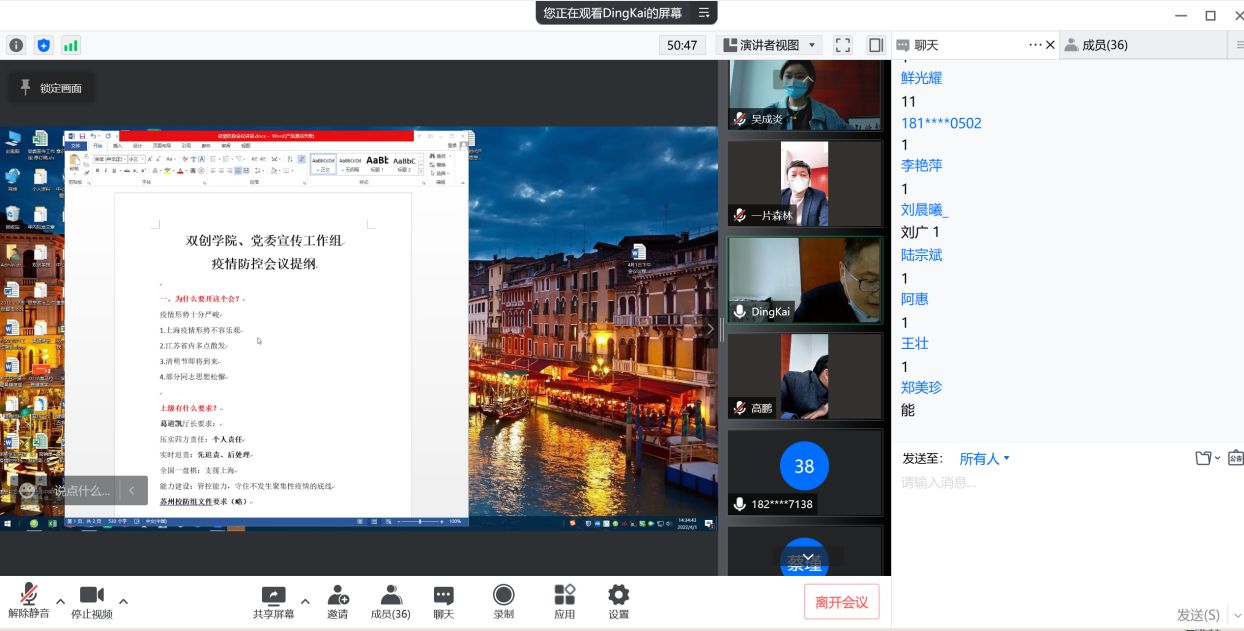 4月1日下午2:00,双创学院召开疫情防控“云上”学习会和项目工作推进会,双创学院全体教职员工参加,党委宣传工作组列席会议。会议由学院党委委员、党委宣传工作组组长、双创学院党政负责人丁锴主持。