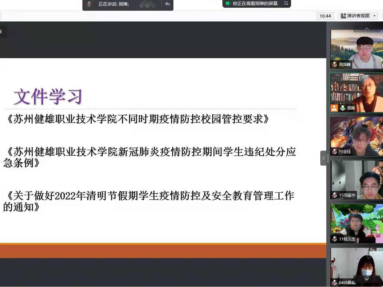 会上,班主任带领同学们一起学习了《苏州健雄职业技术学院新冠肺炎疫情防控期间学生违纪处分应急条例》,特别强调每个学生都是自我防疫的第一责任人,同学们应该遵守科学防疫的有关规定,严格按照属地防疫政策要求,落实防疫措施。针对即将到来的清明假期,班主任传达了学校有关清明节假期学生疫情防控及安全教育的有关规定,确保全体学生平安、顺利度过假期。
