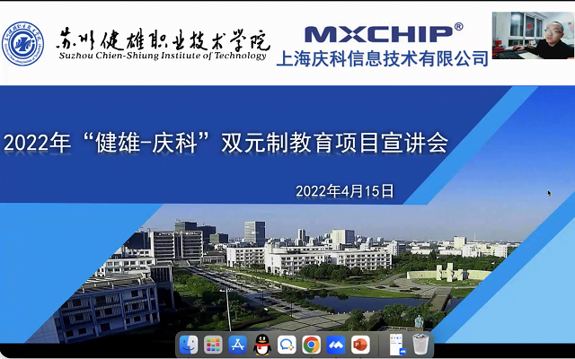 4月15日晚,人工智能学院在线上开展“健雄-庆科”双元制教育项目宣讲会。上海庆科信息技术有限公司(简称“庆科信息”,“MXCHIP”)是国内领先的物联网系统解决方案提供商,为全球企业客户提供产品及场景智能化服务。公司业务涵盖无线模组、芯片、网关等硬件产品,以及云平台、APP等软件服务。为了做好电子物联网专业群的人才培养,也为了服务好长三角区域经济发展,结合我院一直以来“双元制”培养的特色,特此与庆科信息开展双元制合作。