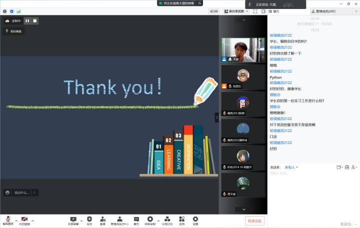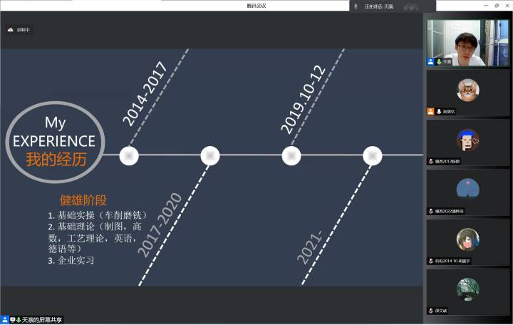 4月21日晚,智能制造学院通过云端开展了“机会,总是留给有所准备并付出行动的人”主题校友讲堂。本次校友讲堂邀请到了应用本科2014班毕业生高天文和模具2022班在校生浦梓成,为全体2020级和2021级中德班的同学分享了他们在中德双元制项目中的成长经历和学习经验。本次校友讲堂由辅导员陆旻忆主持。