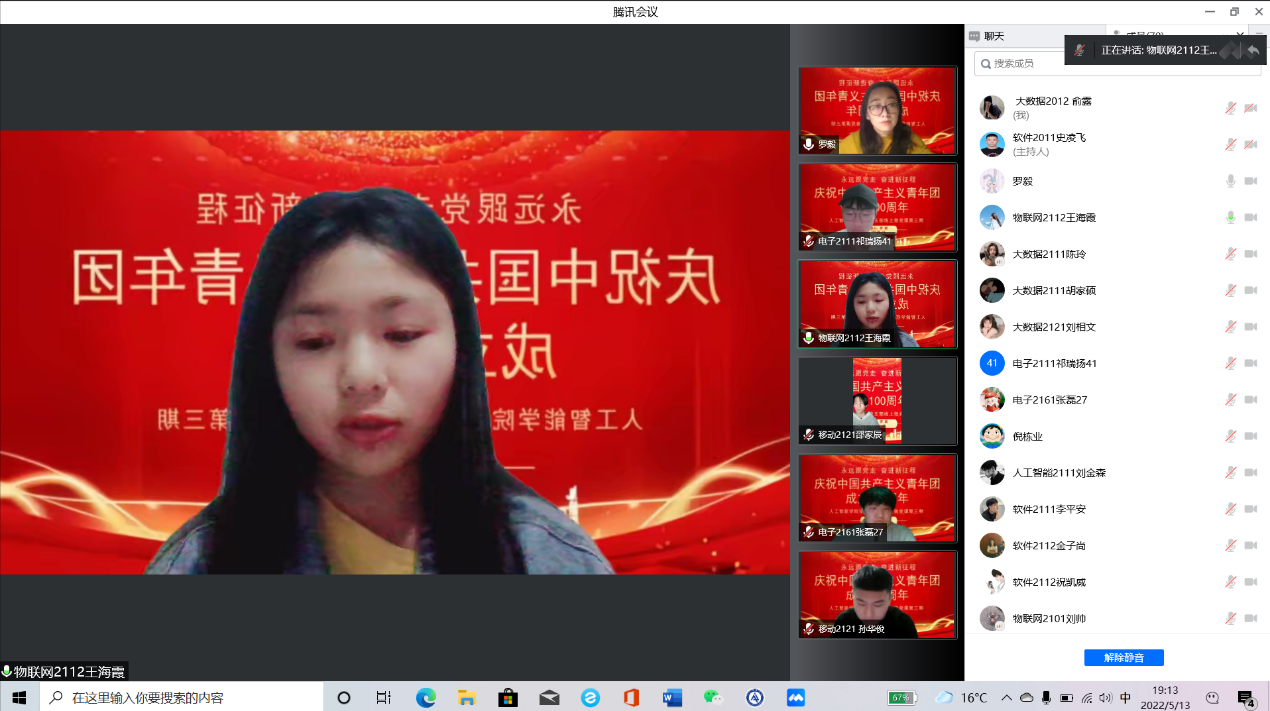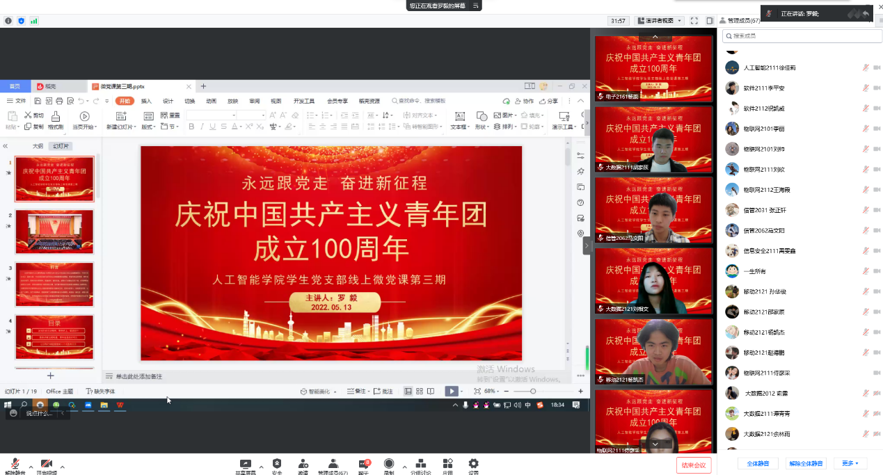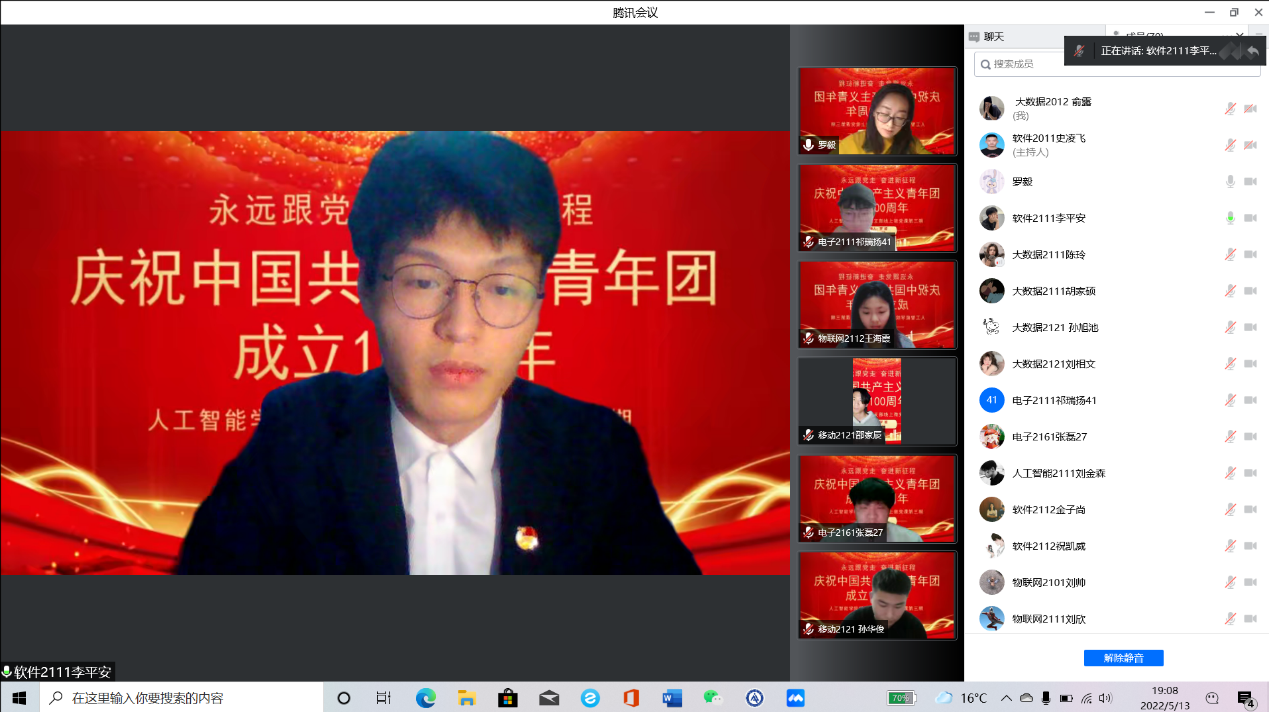 为庆祝中国共产主义青年团成立100周年,鼓励和激励全体学生勇担新时代接班人。5月13日晚,人工智能学院辅导员罗毅老师通过腾讯会议课堂,给人工智能学院线上党支部的学生们上了一堂有意义的线上微党课。