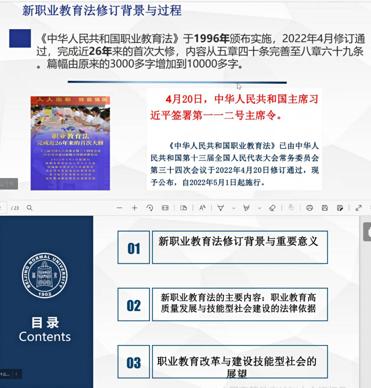新修订的职业教育法从国家法律层面进一步明确了职业教育是与普通教育具有同等重要地位的教育类型,该法共八章69条,已于2022年5月1日起施行。本次学习会主要从新修订的《职业教育法》的背景、核心要义及如何学习贯彻三方面切入,围绕“加强党的领导、强调同等重要、加强统筹管理、推进体系贯通、明确企业主体、坚持多元办学、深化产教融合、突出就业导向、强调德技并修、完善保障机制”等10个关键词,重点学习了教育部政策法规司司长邓传淮关于对新修订的《职业教育法》主要内容和突出亮点的解读。