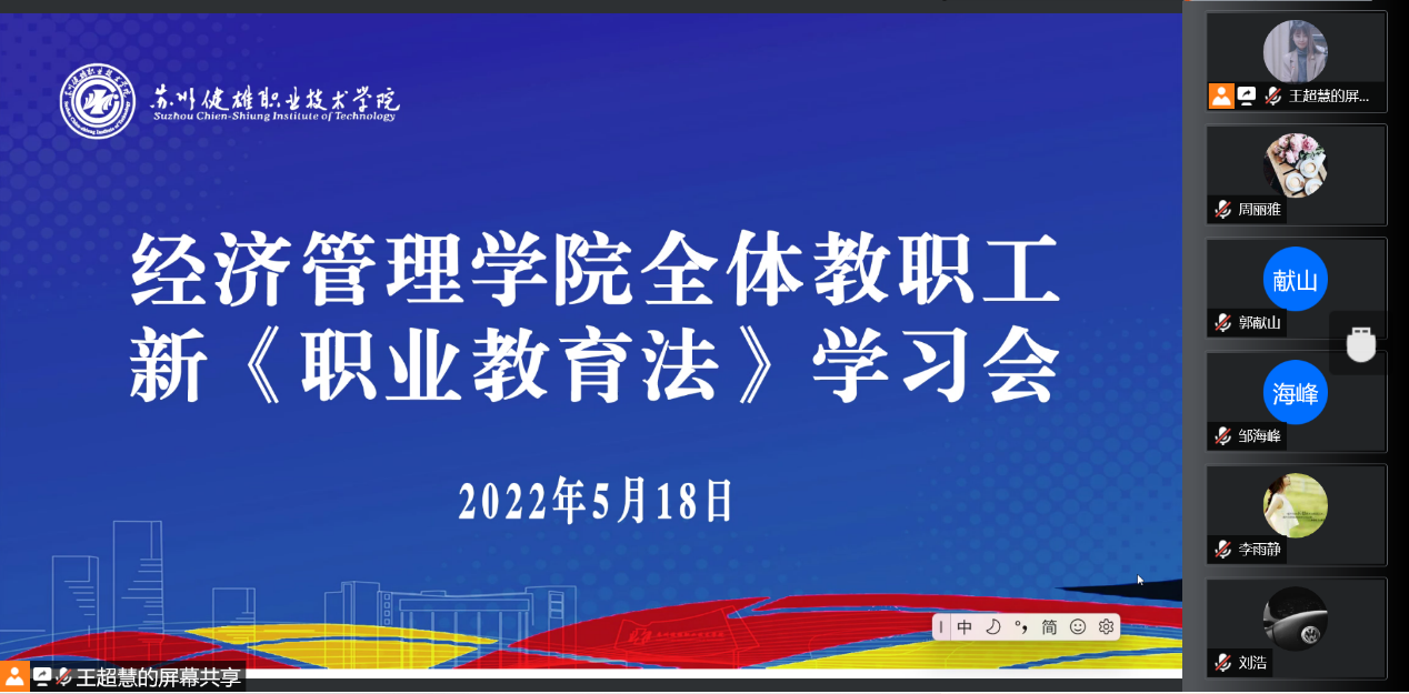 5月18日,经济管理学院组织开展新修订的《中华人民共和国职业教育法》学习会,会议由党总支副书记周丽雅主持,经济管理学院院长苏志勇、副院长樊奇,筹建组成员、全体教职工参加。