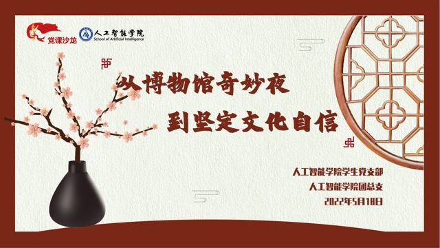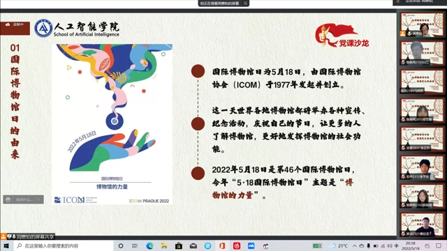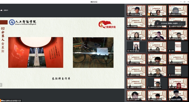 5月18日晚,人工智能学院学生党支部第七期党课沙龙在腾讯会议平台举行,主题为《从博物馆奇妙夜到坚定文化自信》。全体班团干部、入党积极分子、入团积极分子参加,学生党支部书记周懋怡主持。