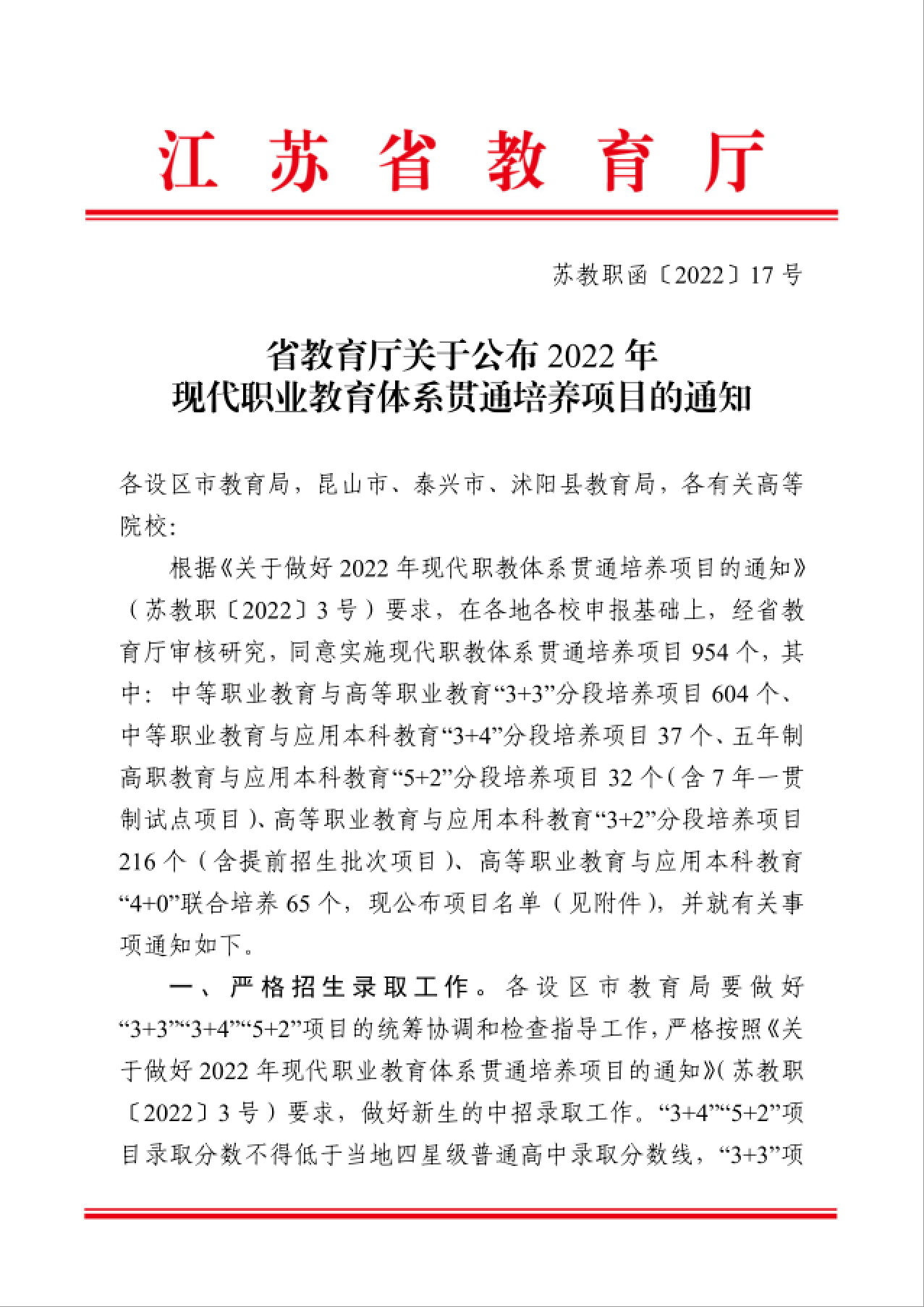 近日,江苏省教育厅发布《关于公布2022年现代职业教育体系贯通培养项目的通知》(苏教职函〔2022〕17号),我院申报的6个高本贯通项目全部获批。其中,高等职业教育与应用本科教育“3+2”分段培养项目5个,高等职业教育与应用本科教育“4+0”联合培养项目1个;加上之前获批的“专转本”项目,我院2022年本科层次招生计划合计335人,本科层次办学规模进一步扩大,持续为区域经济社会高质量转型发展提供“人才仓、技术仓、智慧仓”。(图文/韩学芹 审核/钟鸣)