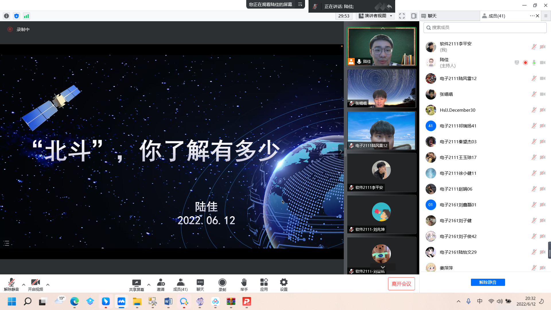 6月12日晚,人工智能学院辅导员陆佳以腾讯会议为平台,给2021级学生干部开展了一场主题为“弘扬科学家精神,我辈义不容辞”的线上微党课。