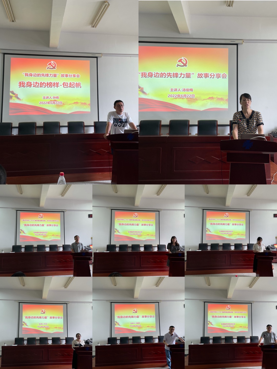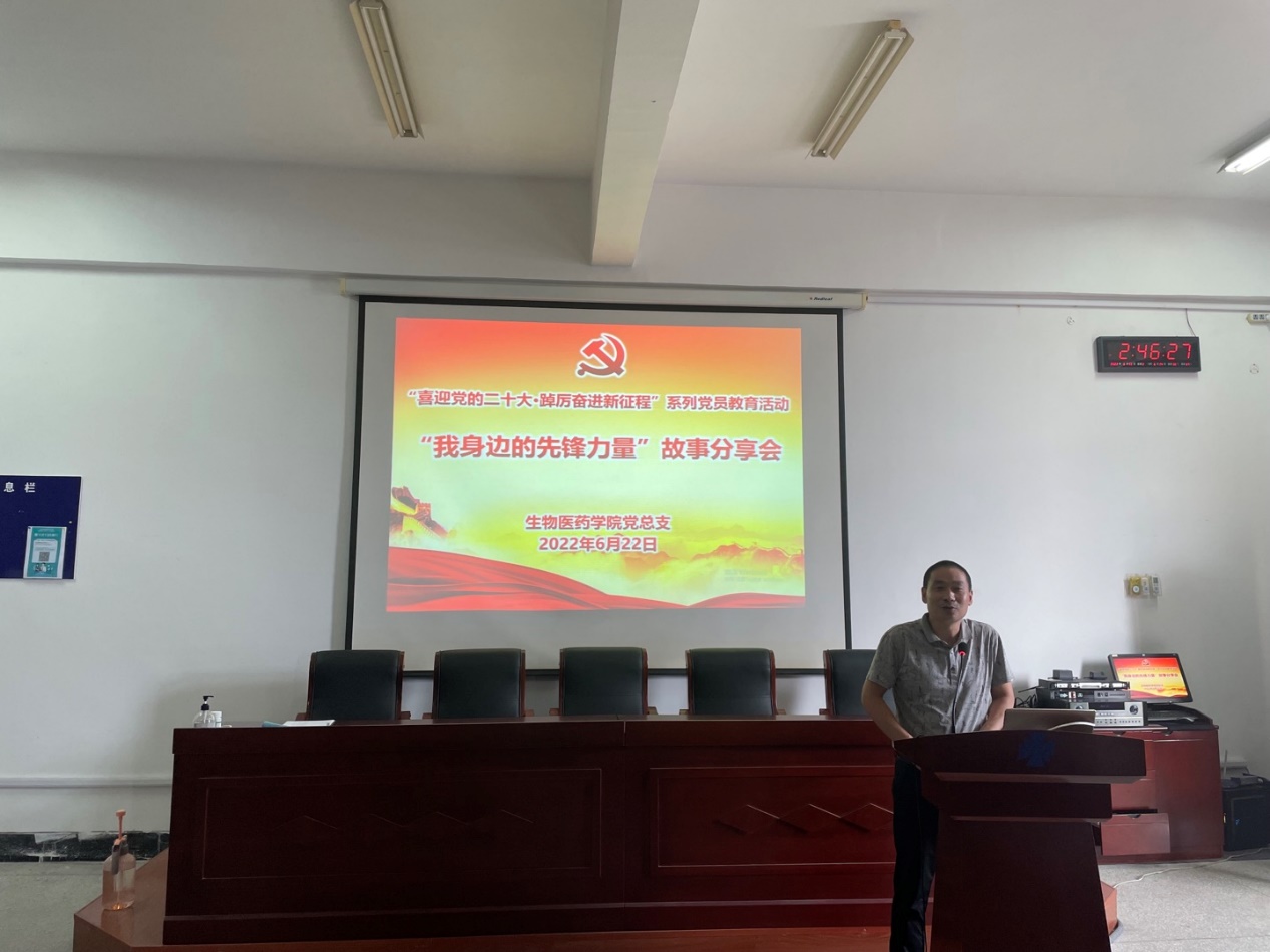 为大力弘扬先锋模范精神,激励全体教职工向先进典型看齐, 传递榜样正能量,6月22日下午,生物医药学院在D3-408开展“我身边的先锋力量”故事分享会,学院党总支书记曹跃兴、副书记贾红圣携全体教职工参加了本次分享会。