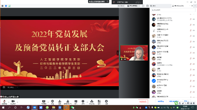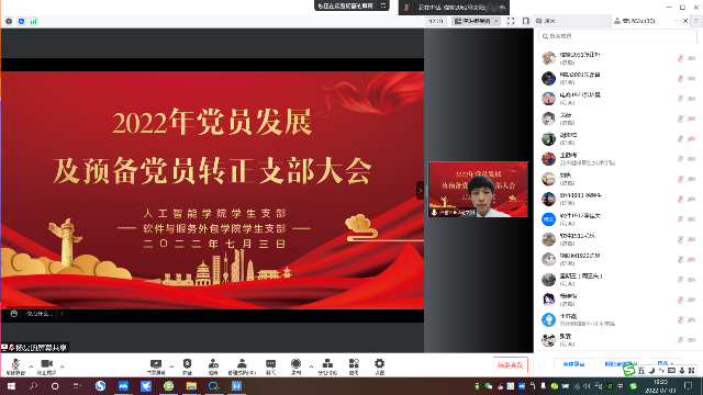 7月3日晚,人工智能学院学生党支部在腾讯会议平台举行了2022年党员发展和预备党员转正支部大会。参加本次会议的有学生支部全体党员、教师党员代表以及拟发展、拟转正党员。