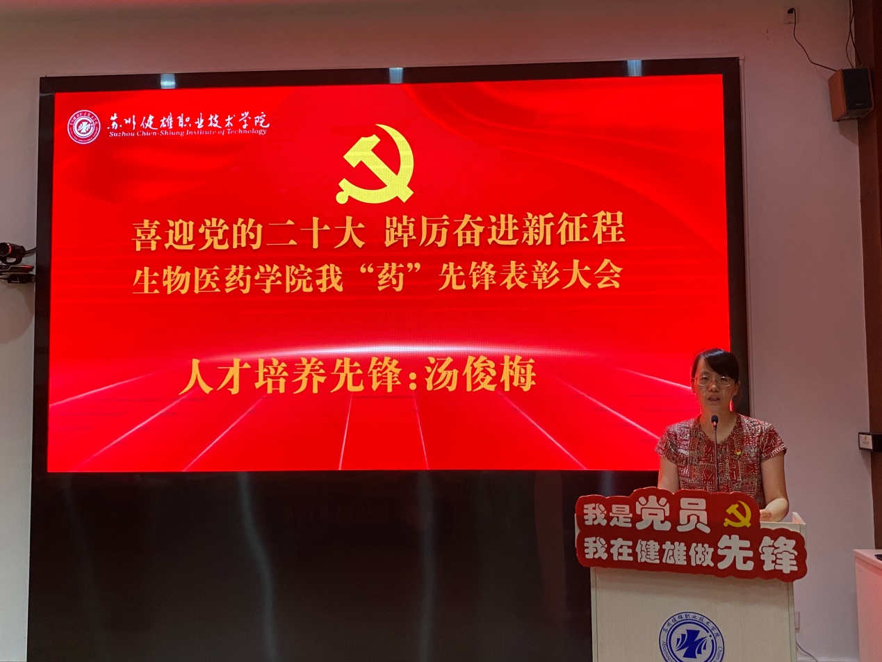 接着,生物医药学院院长顾准教授做重要讲话,她向受表彰的党员先锋教师表达了祝贺。她说,生物医药学院围绕学校高质量发展目标,坚持党建与业务融合发展,努力奋斗,开拓创新,在人才培养、科技创新、社会服务、疫情防控等工作中积极发挥主人翁意识,取得了丰硕成绩。借此机会,她对全体教职工提出三个方面的建议:一是不忘初心,永远保持二级学院优良传统;二是立足岗位,开拓创新成就学院成就自我;三是坚持原则,毫不动摇地走好做好各项工作。希望全体老师,努力学习先进典型、建强战斗堡垒、发挥先锋作用,担当作为、干事创业,不断创造学院高质量发展的新业绩。