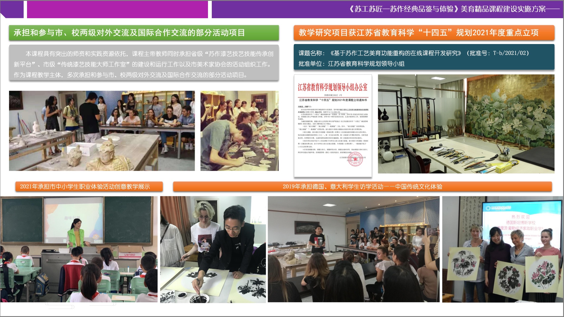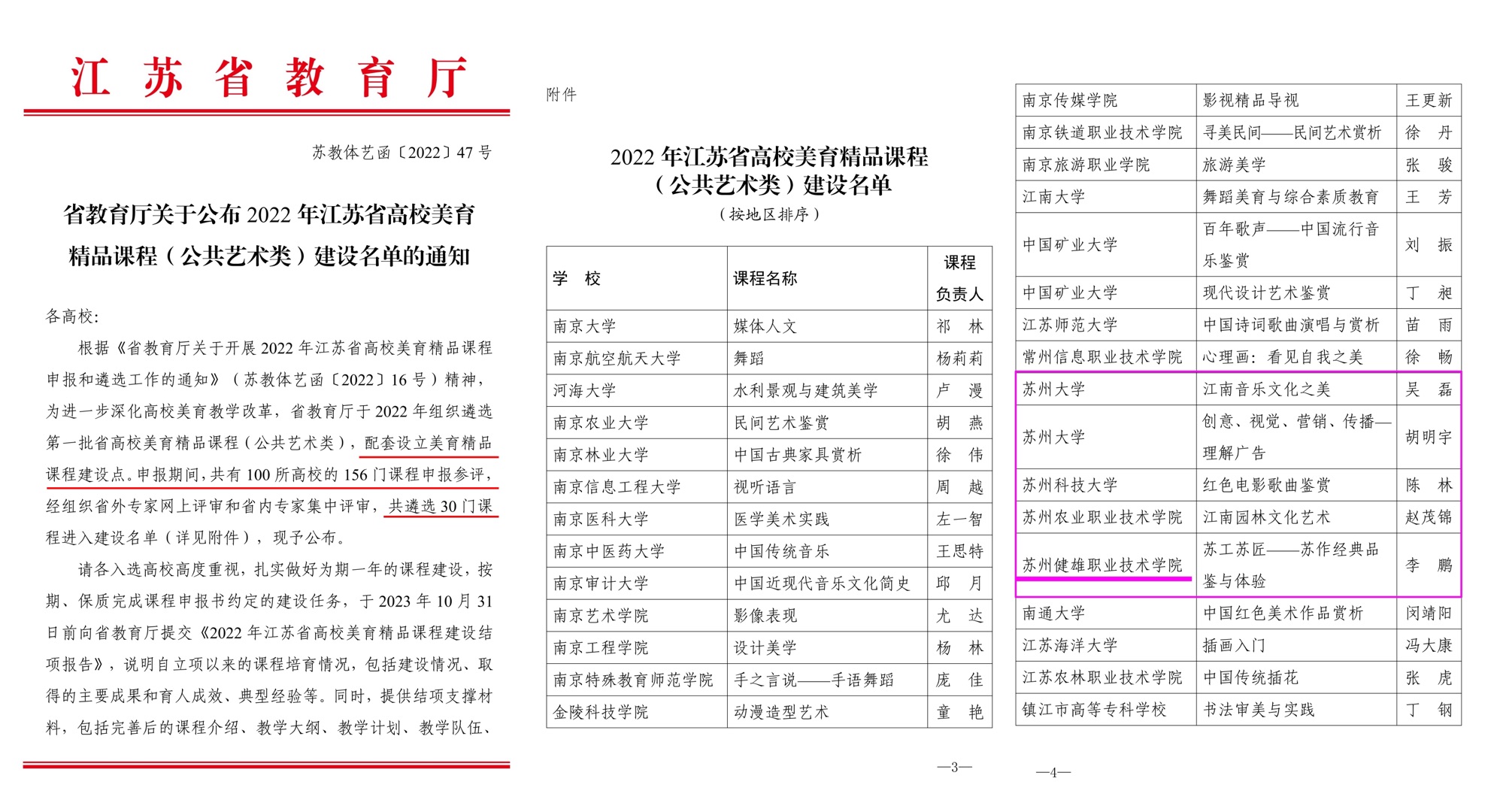 8月30日,省教育厅公布《2022年江苏省高校美育精品课程(公共艺术类)建设名单》,我校艺术设计学院李鹏团队申报的课程《苏工苏匠——苏作经典品鉴与体验》获批立项,成为全省高校首批立项建设的30门美育精品课程之一,并配套设立美育精品课程建设点。