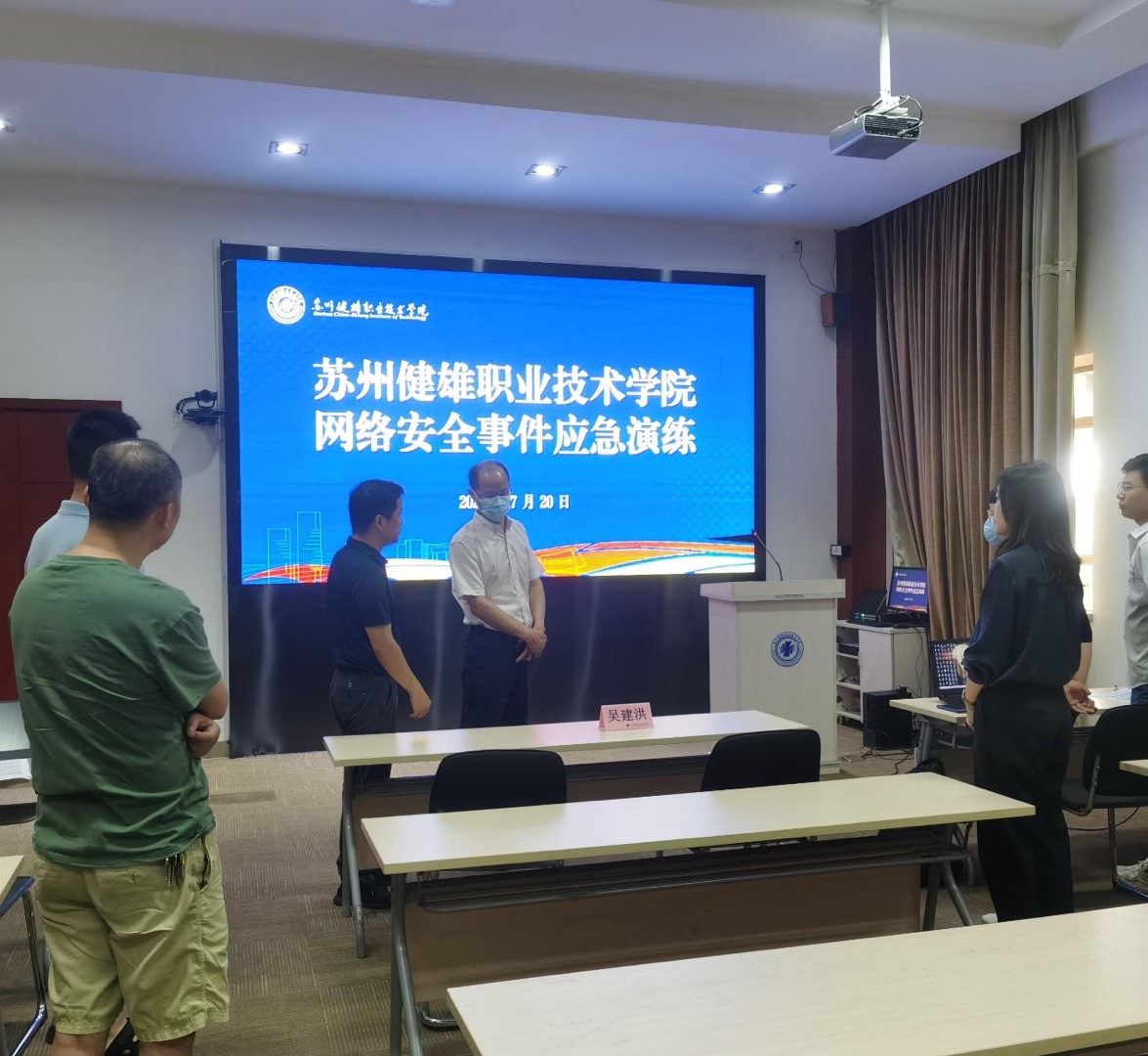 为提高我校网络安全应急处置能力,根据《江苏省教育系统网络安全事件应急预案》和《苏州健雄职业技术学院网络安全事件应急预案》要求,2022年7月20日,我院在吴园第三会议室组织开展了“网络安全应急演练”活动。学院党委委员、副院长吴建洪亲临演练现场指导工作,演练由图书馆(信息中心)高振清老师担任总指挥。