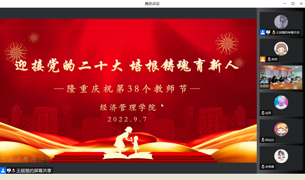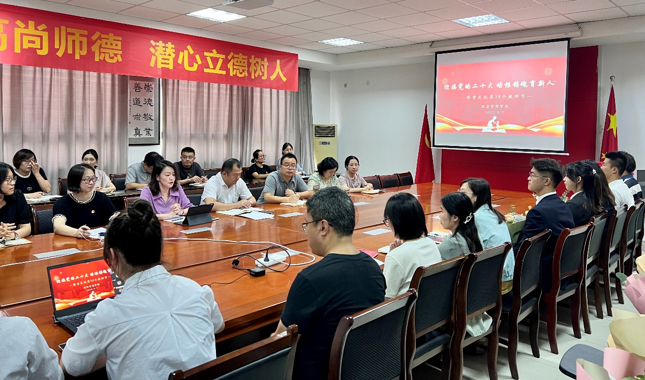 2022年9月7日下午,经济管理学院在C3-202会议室举办“迎接党的二十大,培根铸魂育新人”教师节庆祝活动,学院全体教师、学生代表参加,活动由党总支副书记周丽雅主持。本次活动采取线上线上同时进行方式。