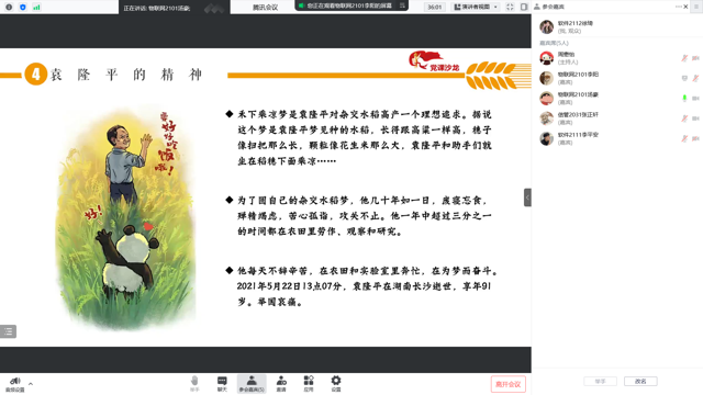 袁隆平曾经说过:“人就像一粒种子,也要做一粒好种子,身体、精神、感情都要健康。种子健康了,我们每个人的事业才能根深叶茂,枝粗果硕。”“种子精神”所蕴含的家国情怀、科学精神、实干力量已成为时代基因,深深根植于中华民族血脉之中。活动中,杨磊、张正轩、曹欣杰、李平安等四位优秀学生代表分别结合自己的经历,分享了对于种子精神的理解和感悟,号召广大青年学生以袁隆平院士为榜样,做一颗质朴的、坚韧的种子,扎根于祖国的山河热土,扎根于人民群众之中,向阳生长,坚守奉献,用奋斗成就出彩人生。(图文/周懋怡 审核/李志刚)