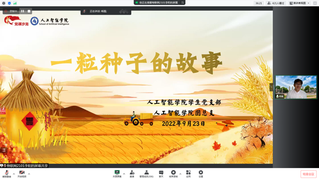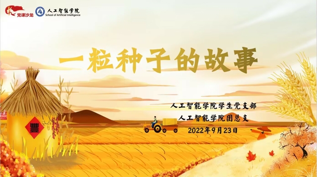 9月23日晚,人工智能学院学生党支部第十一期党课沙龙(秋分特别版)在线下D1-207和线上腾讯会议两个会场同步举行,主题为《一粒种子的故事》。学生党员、入党积极分子以及2021级、2022级各班代表共计350余人参加。本期主持人为院学生会组织部部长、物联网2101团支书李阳。
