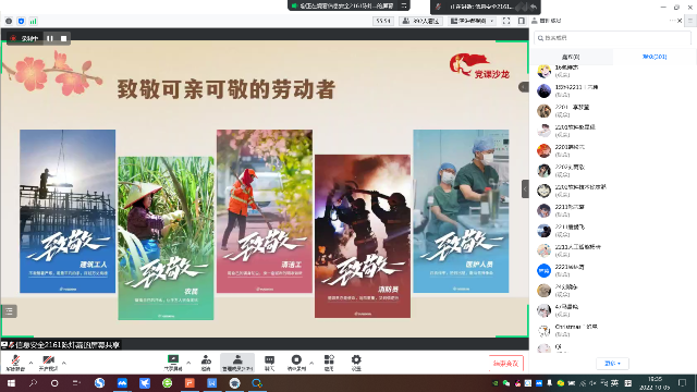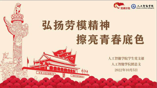 10月5日晚,人工智能学院学生党支部第十二期党课沙龙(国庆特别版)在线下D1-207和线上腾讯会议两个会场同步举行,主题为《弘扬劳模精神 擦亮青春底色》。学生党员、入党积极分子以及2021级、2022级各班代表共计350余人参加。本期主持人为信息安全2161团支书陆紫兰。