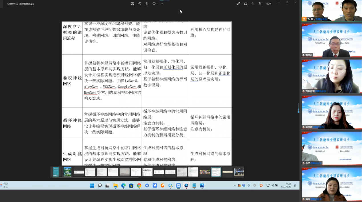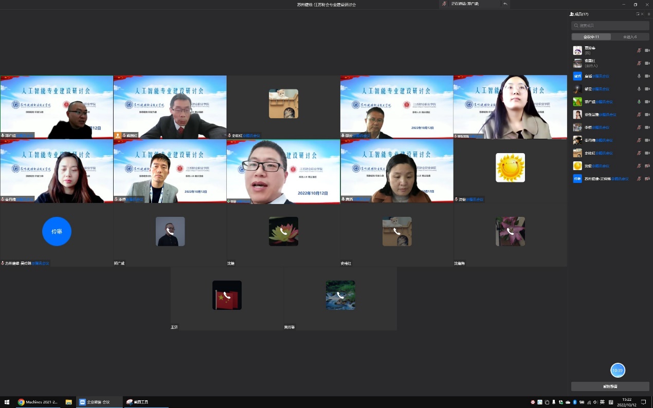10月12日下午,江苏财会职业学院信息工程学院王震院长及相关老师在腾讯会议上与我院人工智能学院探讨人工智能技术应用专业建设,人工智能学院郑广成、章朋及人工智能专业教学团队全体教师参加研讨会。