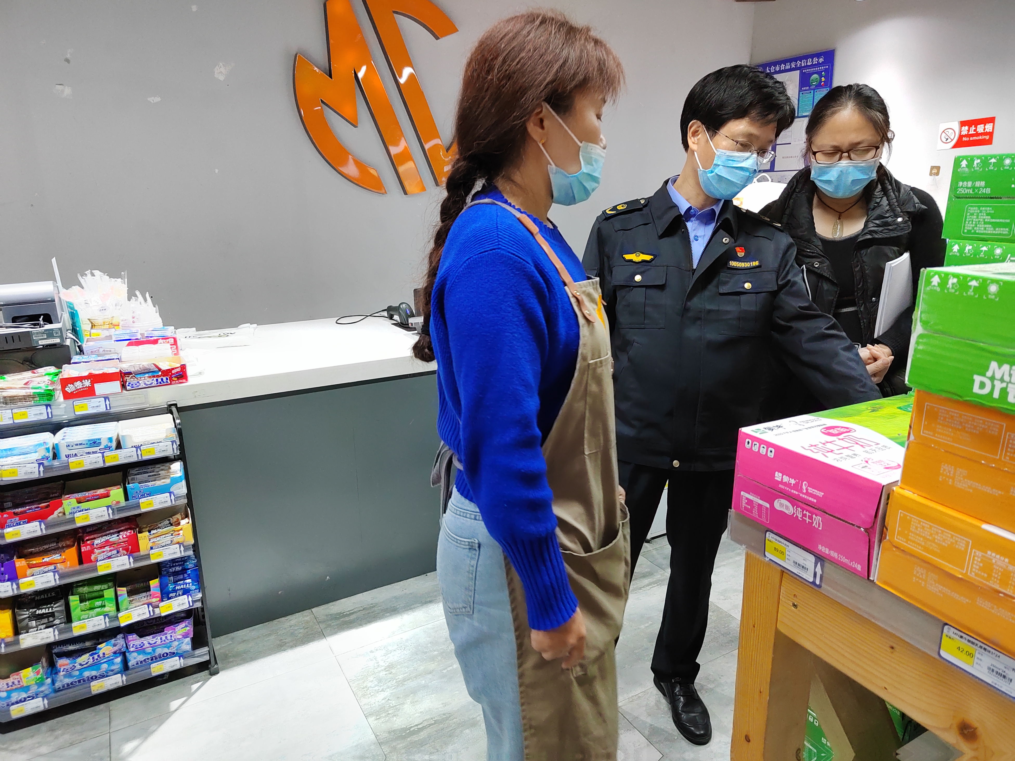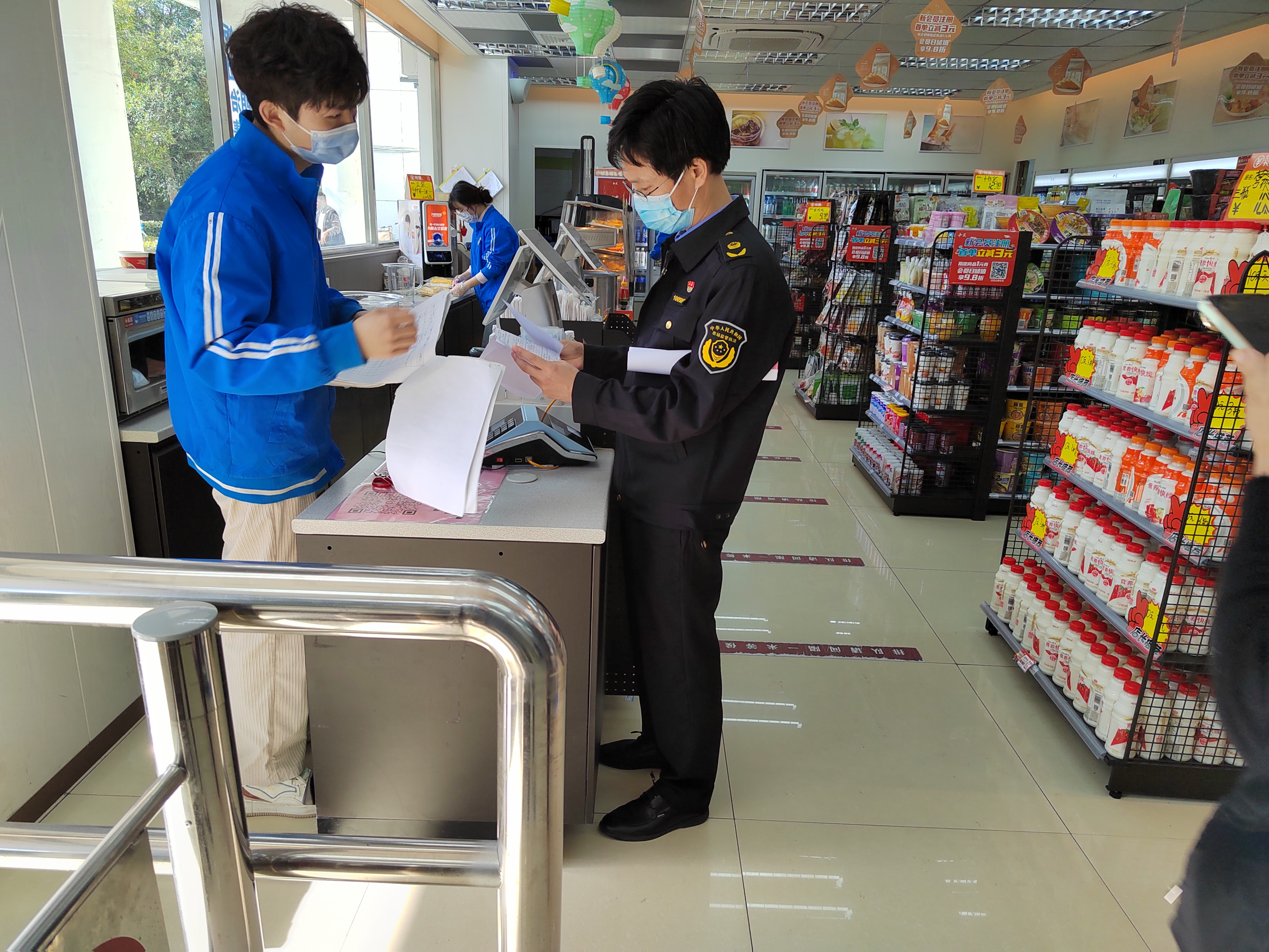 在商超店铺,执法人员随机抽检学生常用的五样商品(方便面、饮料、面包、休闲食品、文具),现场扫码获取进价,与售卖价比对,经核查本次抽检商品均符合市场指导售价。