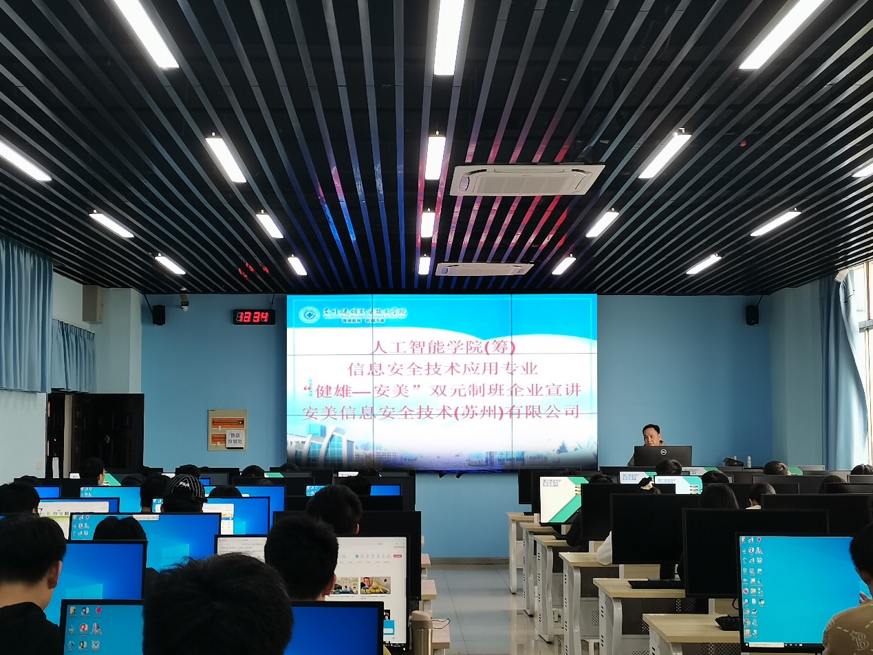 10月26日下午,安美信息安全技术(苏州)有限公司总经理金建峰,在D1-403为信息安全技术应用专业2021级学生,进行“健雄-安美”双元制班企业宣讲。