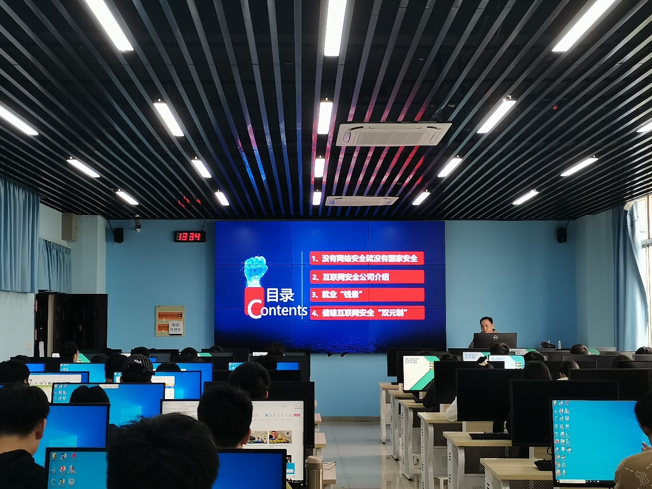 专业带头人刘静老师先给大家介绍了双元制班级的办班初衷及学生就业状况,并对所学专业技能进行了介绍。随后金总从网络安全上升为国家战略层次着手进行宣讲,指出行业对网络安全人才需求量大,在校学生应该珍惜在校进安全企业学习的机会,进一步拓展专业技能,为建设网络强国添砖加瓦。接着金总给学生们介绍了公司的基本情况、双元制班人才培养方案、职业发展规划、公司福利等方面。最后和学生进行交流解答,完成了双元制班学生报名工作。(图/刘静 文/沈啸 审核/郑广成)