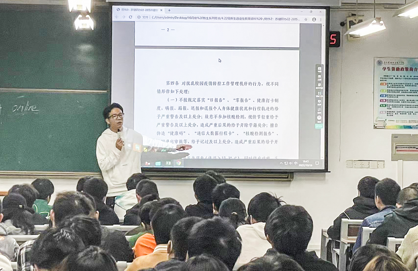 随后,辅导员鼓励学生以二十大精神为引领,增强实现中华民族伟大复兴的责任感和使命感,希望大家在未来三年的学习生活中明确目标,严于律己,珍惜时光。同时,一起学习了健雄学院“红八绿十”和智能制造学院“君子20条”等大学生日常行为规范,提醒学生从自身做起,严格规范自身的日常行为,争取在健雄的舞台大放异彩。