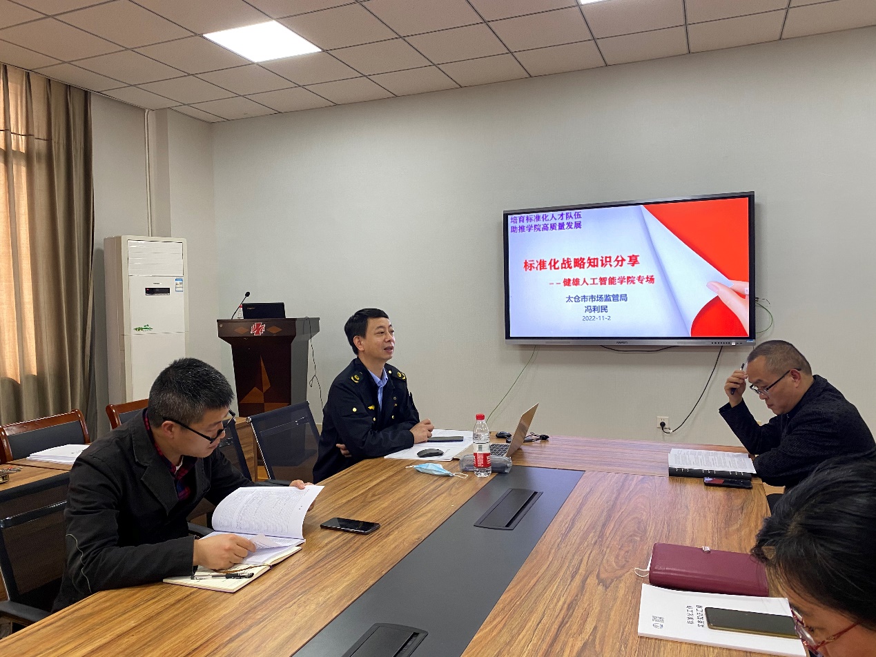 为了进一步推进标准化工作、提升全体教师的标准化业务能力,11月2日下午,人工智能学院邀请太仓市场监管局计量和标准科冯利民科长来校为全体教师开展讲座,讲座主题为《标准化知识战略分享》。