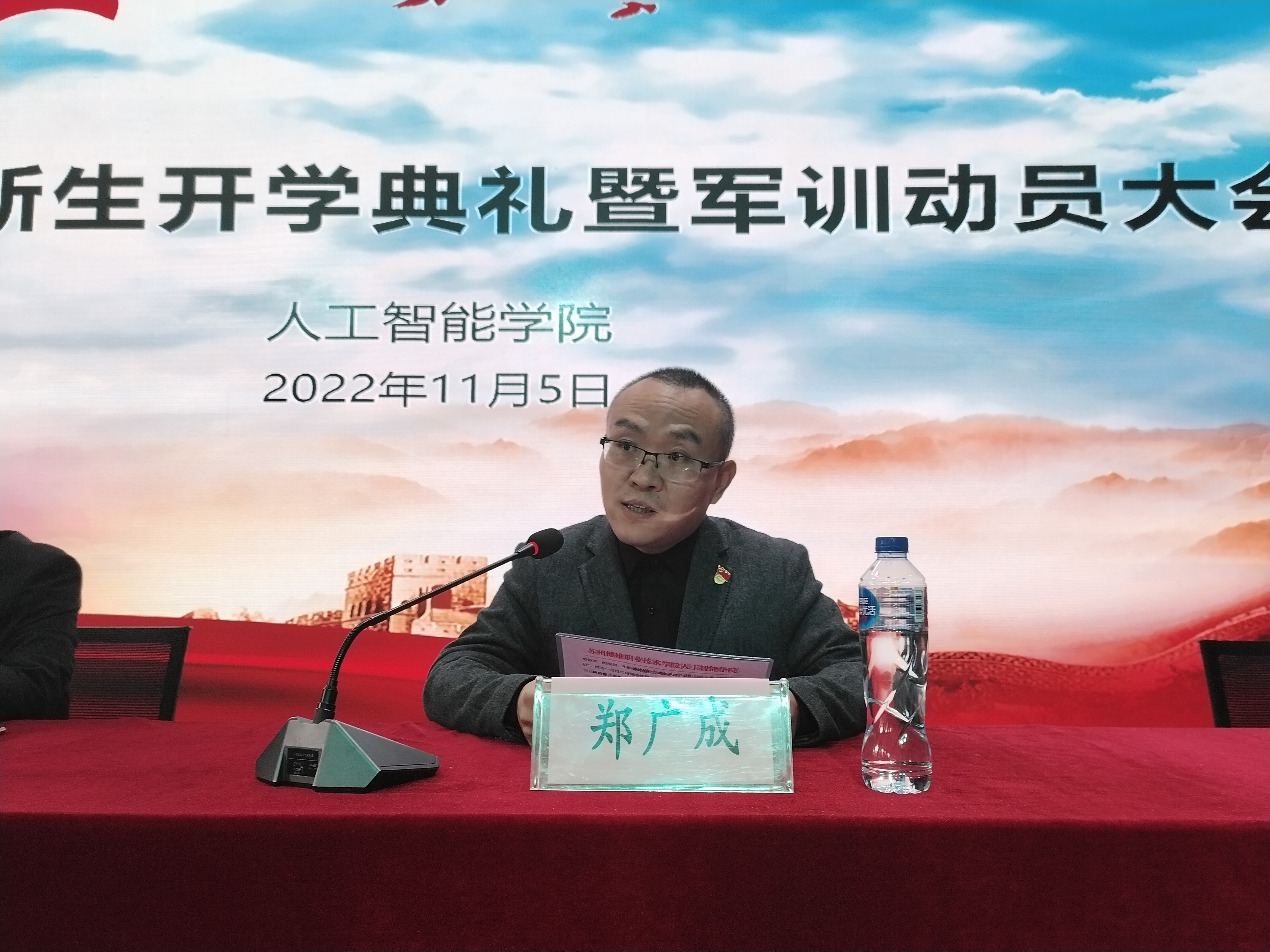 大会在雄壮的国歌声中拉开帷幕,首先由郑广成老师作开学致辞,并向同学们介绍人工智能学院基本情况,郑老师对新生提出三点希望:第一,要有大情怀;第二,要有大作为;第三,要有大成就。