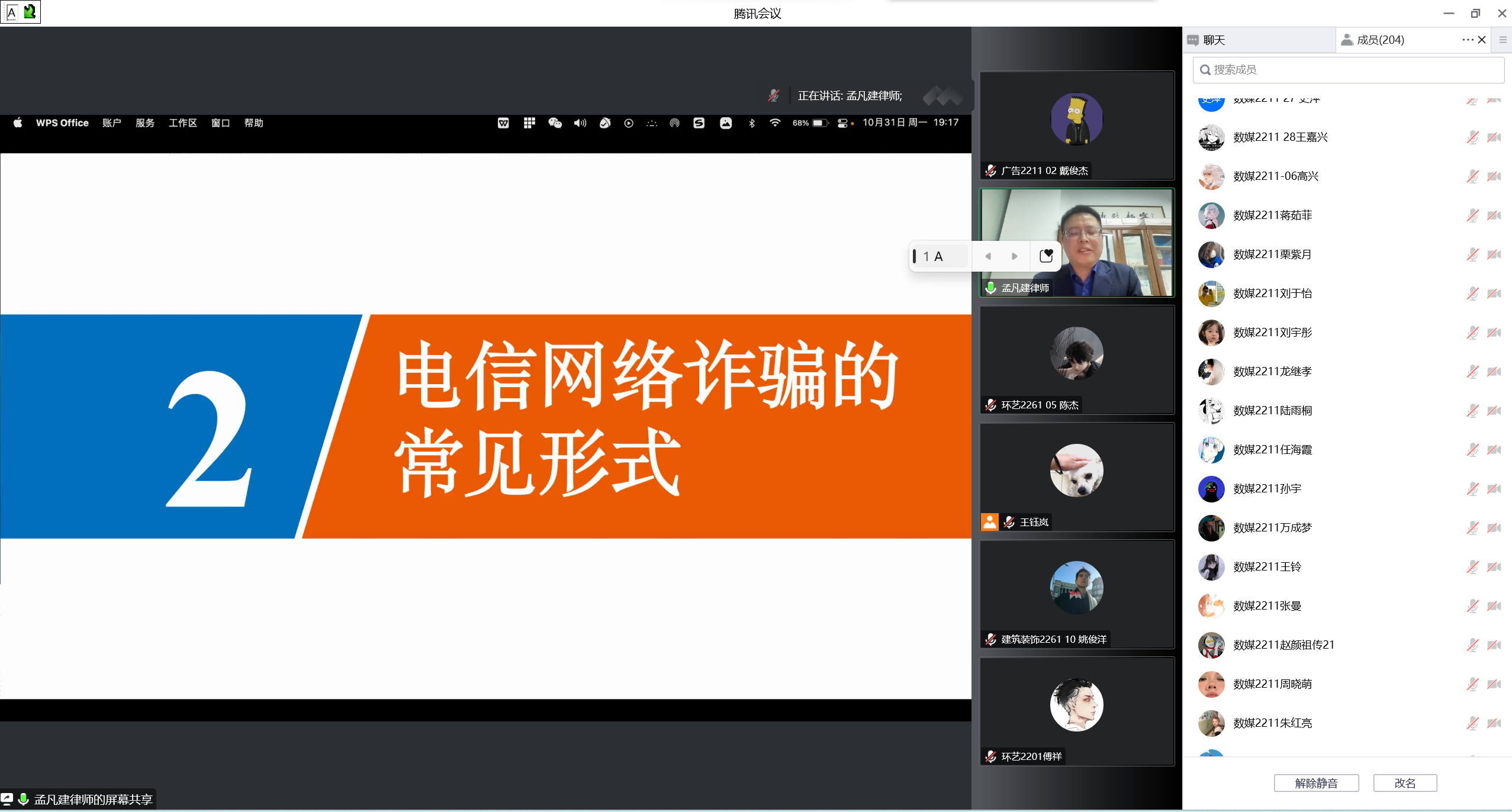 孟凡建律师通过真实案例分析、法律条文讲解,从法律及道德两方面向学生讲解相关案例,以案讲纪、以案释法,贴近生活、通俗易懂地向学生讲解了校园电信诈骗及法律相关知识,有效提高了学生的自我保护意识及法律意识。
