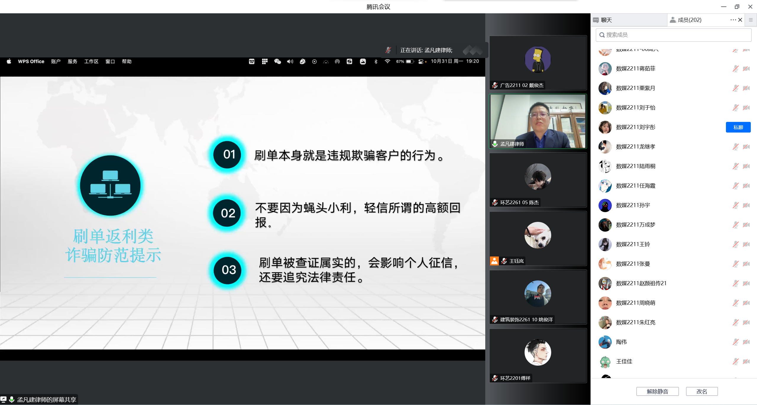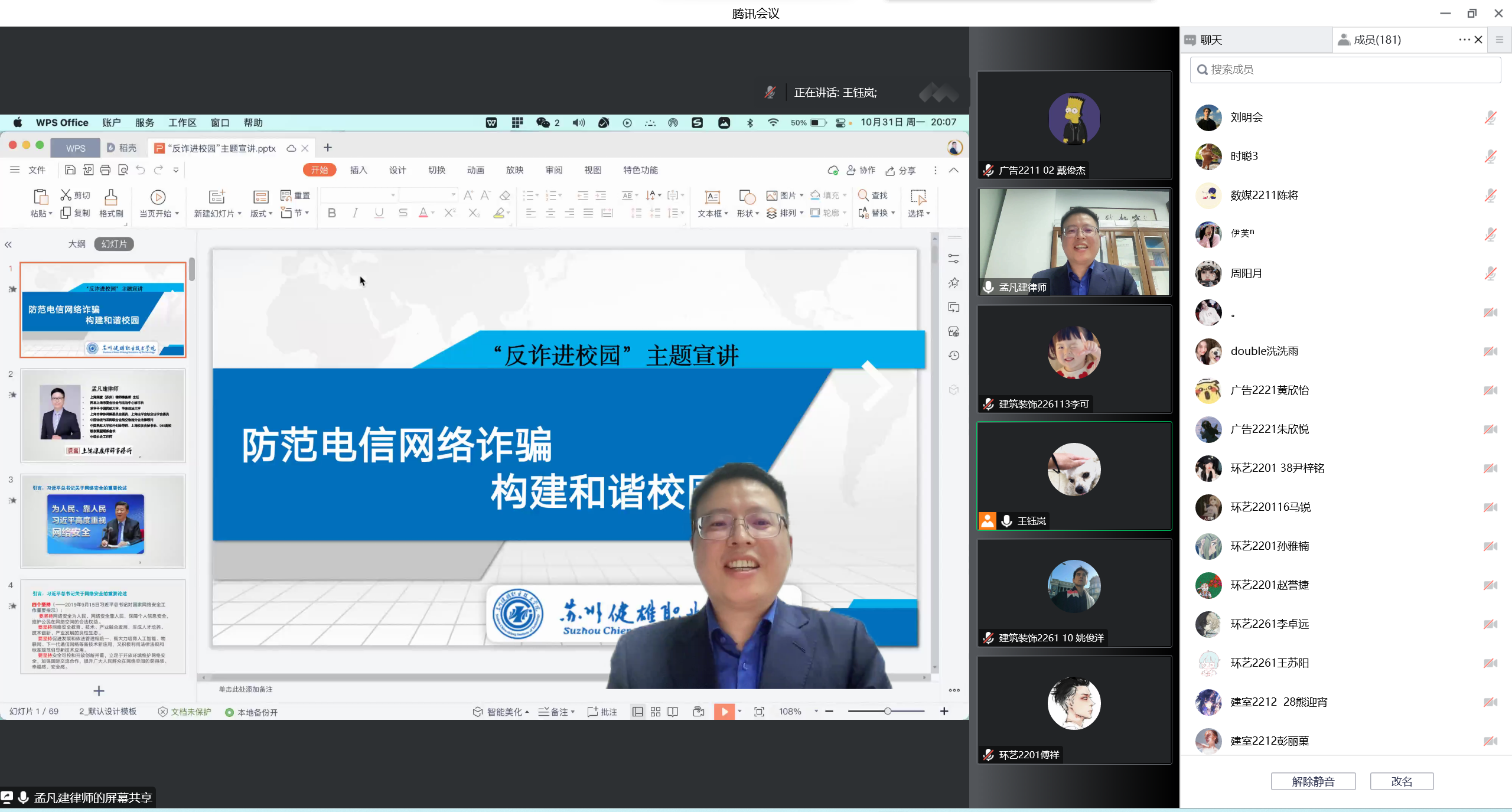 为加大校园法治教育力度,提高学生的法律意识,营造平安和谐的育人环境,艺术设计学院面向学生开展法治安全教育,邀请上海深度(苏州)律师事务所孟凡建主任开展《防范电信网络诈骗,构建和谐校园》的主题宣讲,全体2022级学生通过腾讯会议认真聆听了讲座。
