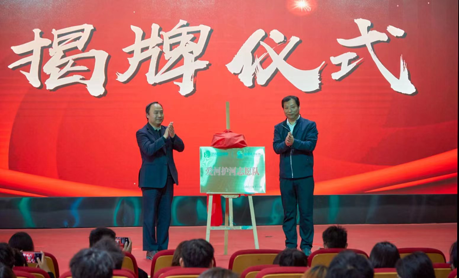 会上,城厢镇建设局党支部书记吴建明先生首先上台致辞,他对青艺志愿者前期的志愿服务给予了表扬和肯定,并对志愿服务队提出了新的要求和期许,还对未来的共建活动做出了规划和畅想。接着,吴建明书记和艺术设计学院党总支书记陈邦琼一起为“青艺护河志愿者服务队”的成立揭牌。“青艺护河志愿者服务队”的成立标志着青艺志愿者的队伍建设迈入新阶段,步入新征程。