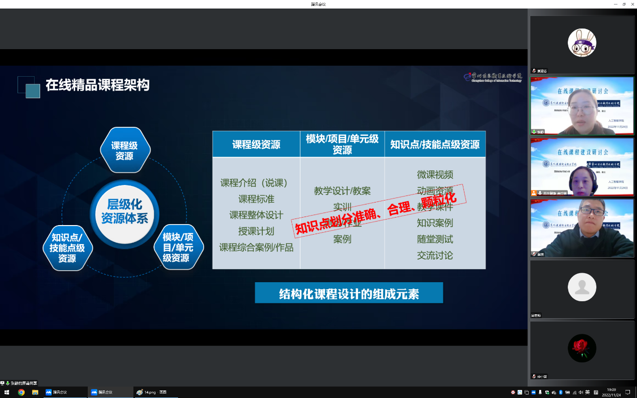 11月24日晚,人工智能学院举办了《在线精品课程建设及课程资源开发》的专题讲座,就如何开发高质量的线上课程进行研讨。本次活动邀请了常州信息职业技术学院的张静教授,张教授系校级教学名师、国家级创新教学团队的骨干成员,主持、参与多门国家、省级在线课程建设,荣获2021年教师教学能力大赛国赛一等奖,具有丰富的课程设计和建设的经验。本次讲座由吴伶琳副教授主持,软件技术团队和大数据技术团队的专任教师参加。