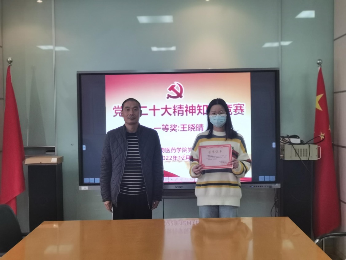 为深入学习贯彻党的二十大精神,进一步将党的二十大精神学习宣传贯彻工作引向深入,切实把教职工的思想认识和行动统一到党的二十大精神上来,生物医药学院于12月1日在学院五楼党员活动室举行“学习贯彻党的二十大精神”知识竞赛。本次竞赛活动以闭卷笔试方式进行,最后,王晓晴老师以98分获得第一名,李慧、范平平老师分获二三名。