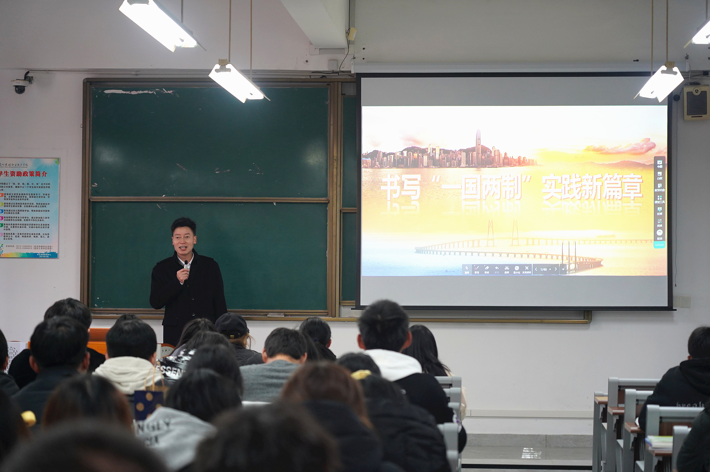 为深入贯彻习近平总书记关于“大思政课”的重要指示精神,积极推进融合式教学改革,突出思政课立德树人、培根铸魂的重要作用,12月5日下午,学院党委委员、纪委书记赵勇走进课堂、走上讲台,用心用情,以“书写‘一国两制’实践新篇章”为主题,为2022级学生带来了一场精彩纷呈的思政课。