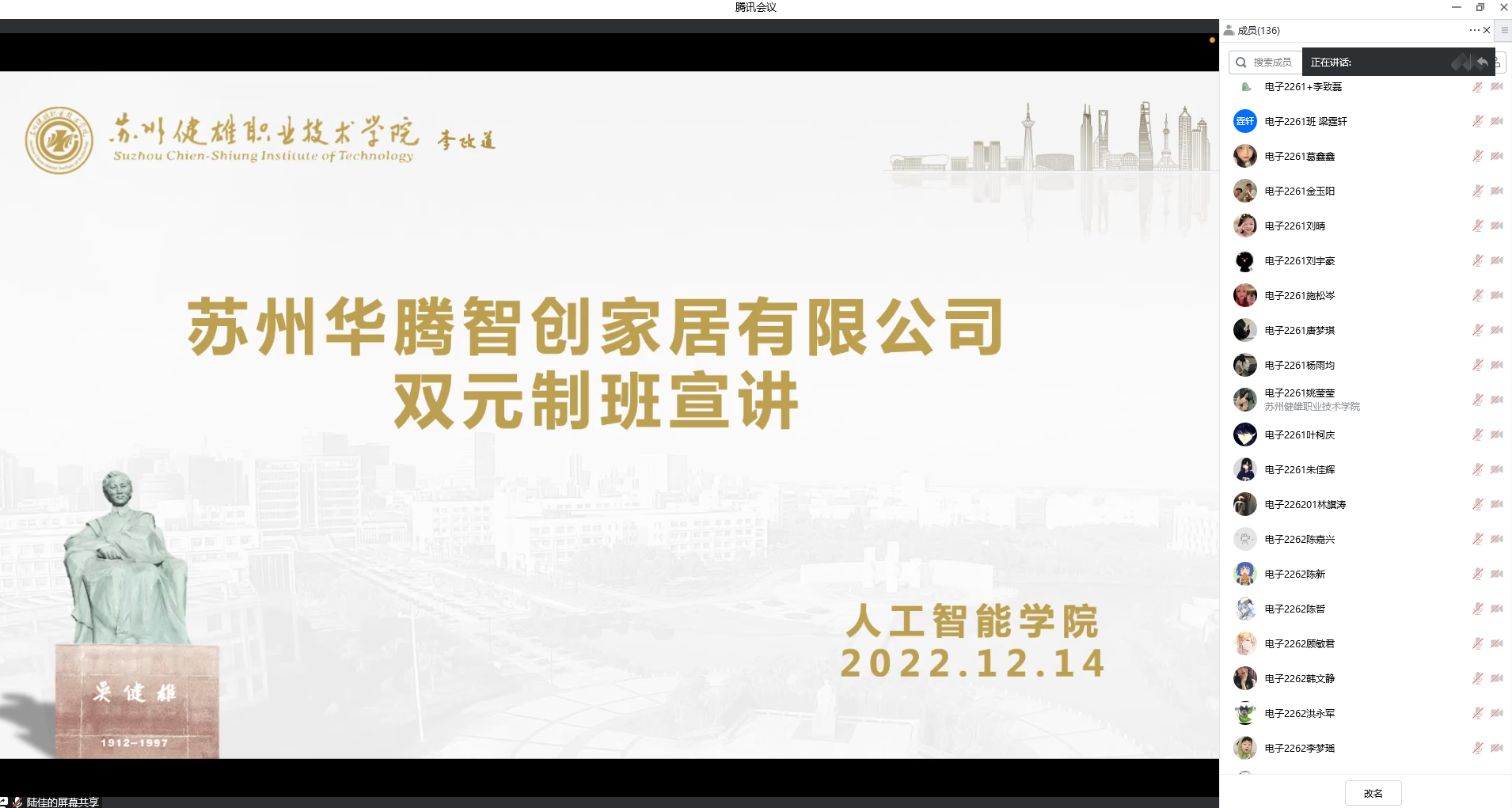 12月14日下午,人工智能学院在腾讯会议平台举行“苏州华腾智创家居有限公司”双元制班宣讲。苏州华腾智创家居有限公司全面引进德国高新智能技术资源,同时结合我国居住环境的特点,专注于灯光系统、窗户窗帘控制系统、温控系统、安防系统、家庭影音系统等控制系统产品的研发、生产、销售、设计、安装与施工于一体的综合性智能化系统集成。