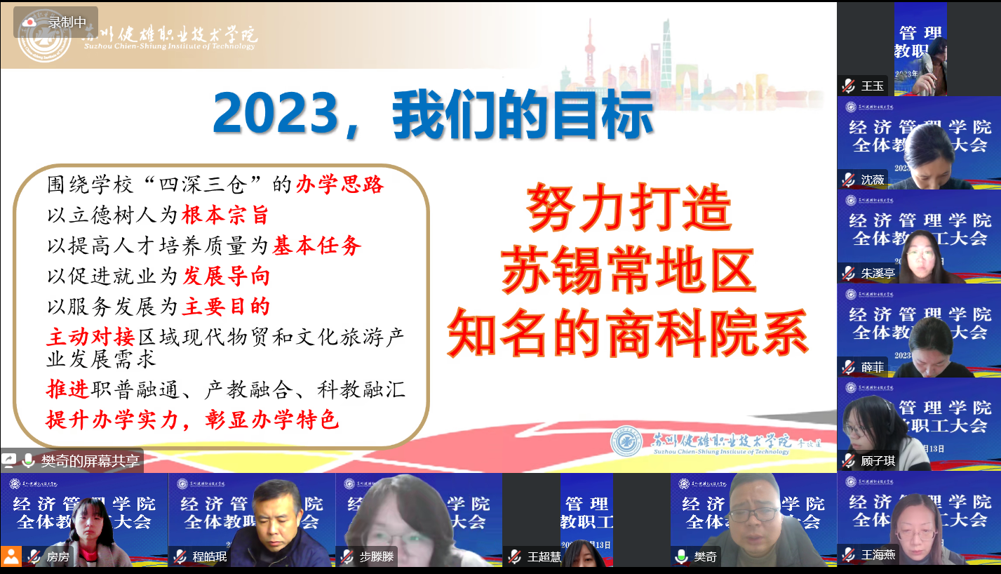 会议总结了2022年学院发展各项工作和取得的成绩,科学谋划2023年事业发展目标,在“十四五”发展的新征程上,力争把学院打造成苏锡常地区知名的商科院系。