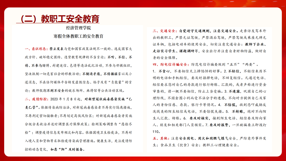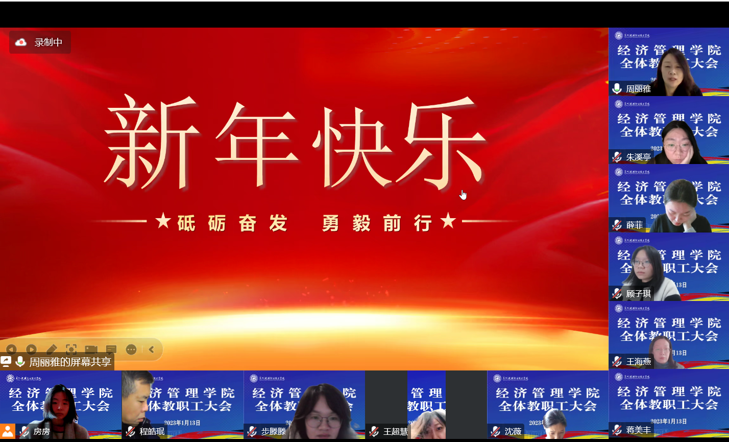 经济管理学院党总支副书记周丽雅对2022年党建工作及取得的成绩进行了总结汇报,对全体参会教职工开展了廉政教育及安全教育,再次明确教职工假期要求,希望全体教职工在利用假期进行修整的同时,也要严守党和学院的各项规章制度,过一个廉洁文明、健康安全的假期。同时,号召教职工团结奋斗,心往一处想,劲往一处使,同舟共济,万众一心,2023年共创新佳绩!