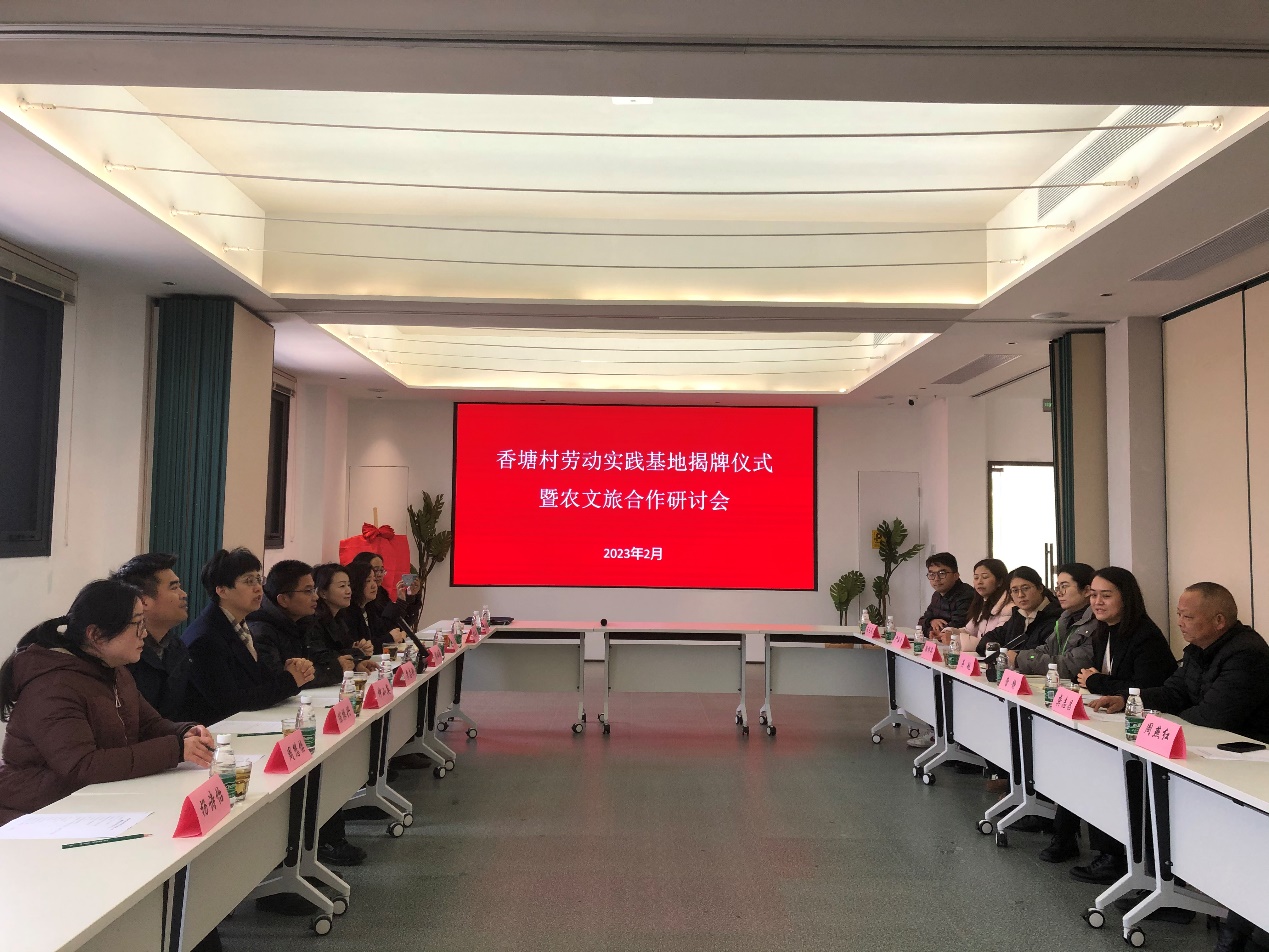 在香塘书局会议室,李志刚与香塘村书记龚志昌进行了劳动实践基地揭牌,校、政双方就如何建设劳动基地、开展农文旅合作进行了交流研讨。顾烨婷等人就香塘村目前发展现状做了总体介绍,并指出香塘村目前发展面临的问题:缺少人力、信息化不足、旅游规划有待优化、缺乏员工培训等。李志刚和周丽雅等人分别介绍了学院特色、专业分布,表达合作意向,对如何开展劳动基地、实训基地建设进行讨论,希望双方进一步丰富合作内容,拓展合作领域,以服务地方产业,实现互利共赢。曹静就未来双方在劳动基地、实习实训、学生就业三大方向再次表示了合作意向。