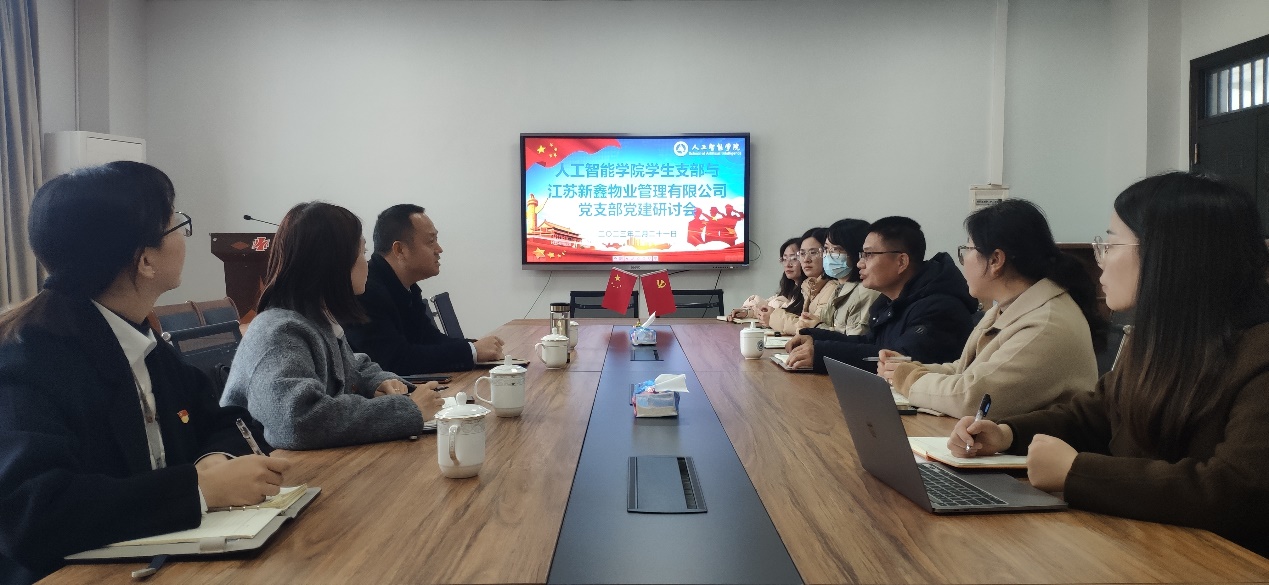 2月21日下午,人工智能学院党支部李志刚书记、辅导员,新鑫物业党支部杨维亮总经理等一行4人在D2-303召开支部党建共建研讨会。双方就前期达成意向进行进一步交流,明确双方在实训楼口袋公园建设中的各自职责,充分利用双方党建资源,将党建共建落到实处。