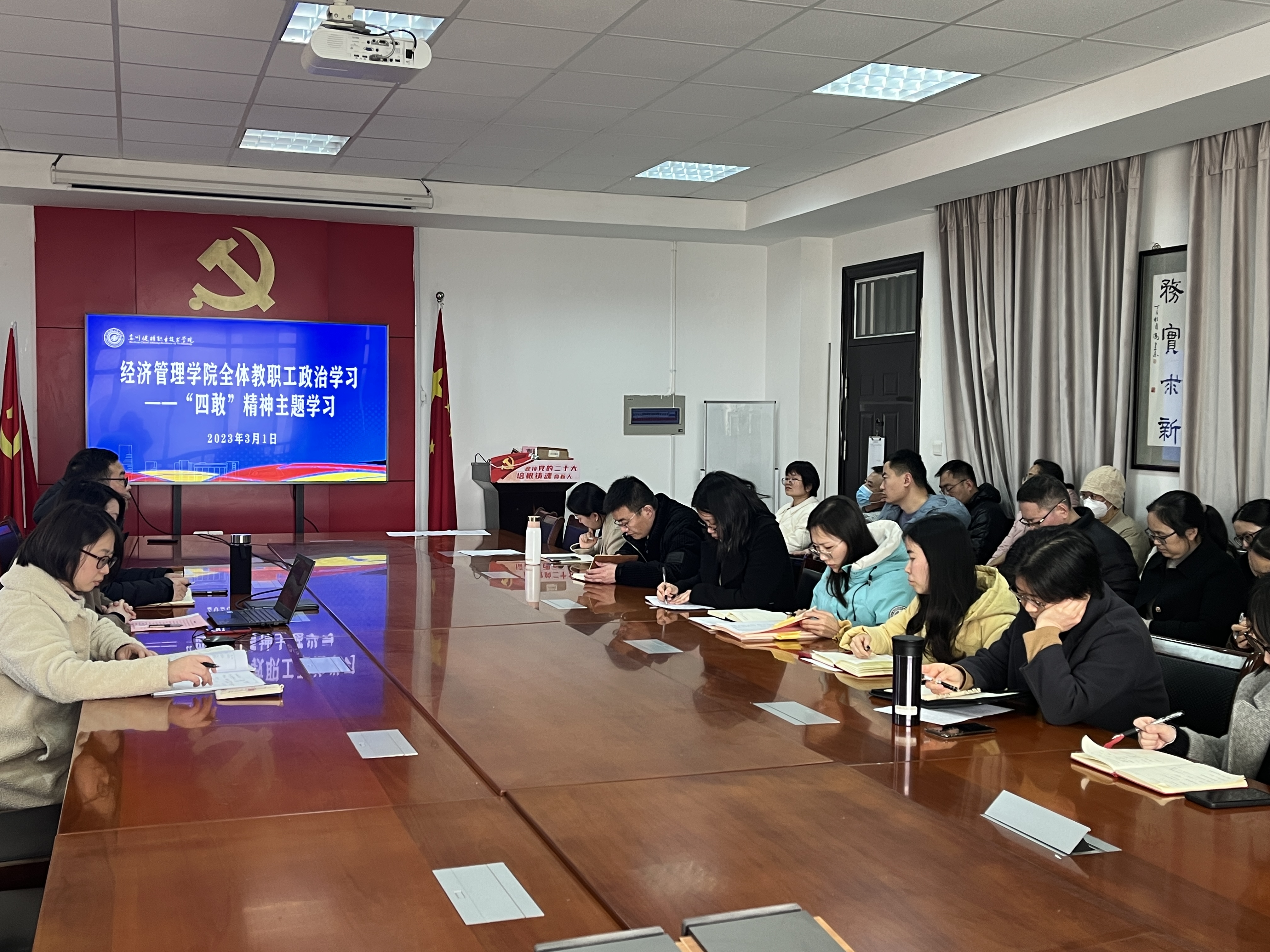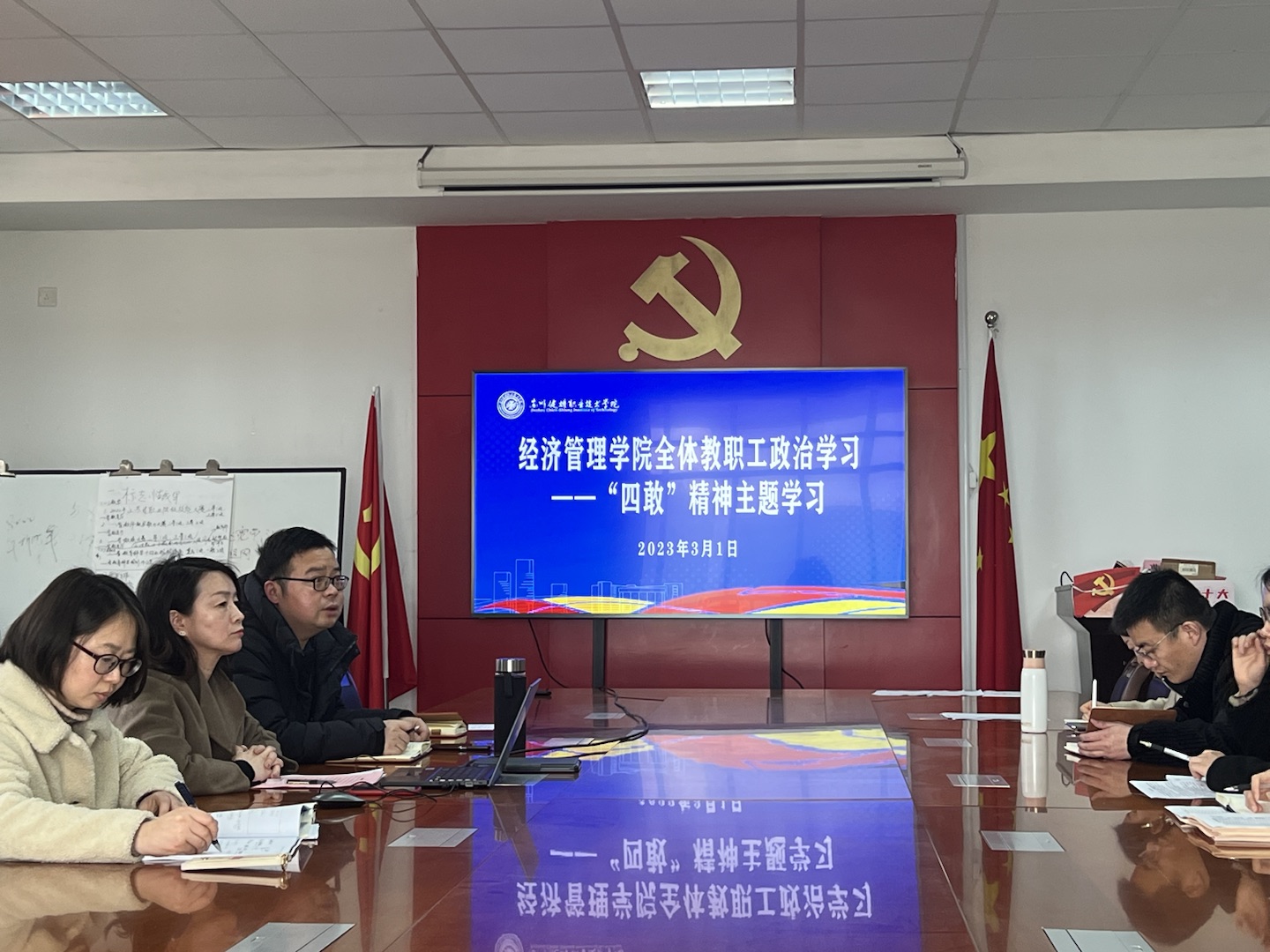 3月1日下午,经济管理学院开展“四敢”主题学习。学习会由党总支副书记周丽雅主持,经济管理学院筹建组全体成员和教职工参加学习。