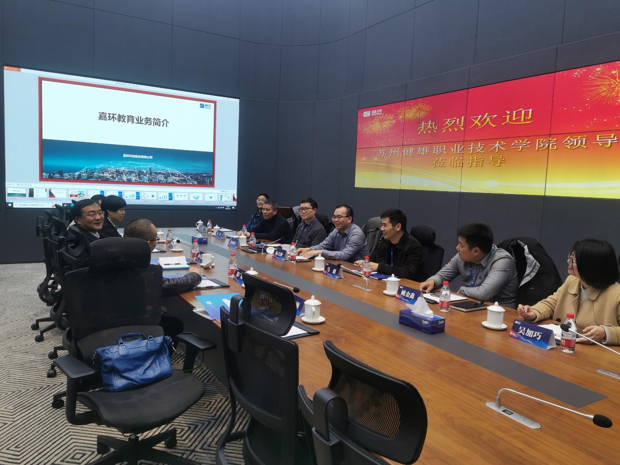 为加快构建现代化职业教育体系,加强现代产业学院建设,推动人才培养和校企合作高质量发展,3月3日,苏州健雄职业技术学院院长林长永带领人工智能学院组长郑广成、副组长仲小英以及专业带头人胡宏梅老师到嘉环科技股份有限公司进行参观考察,洽谈联合建立产业学院合作可能性。