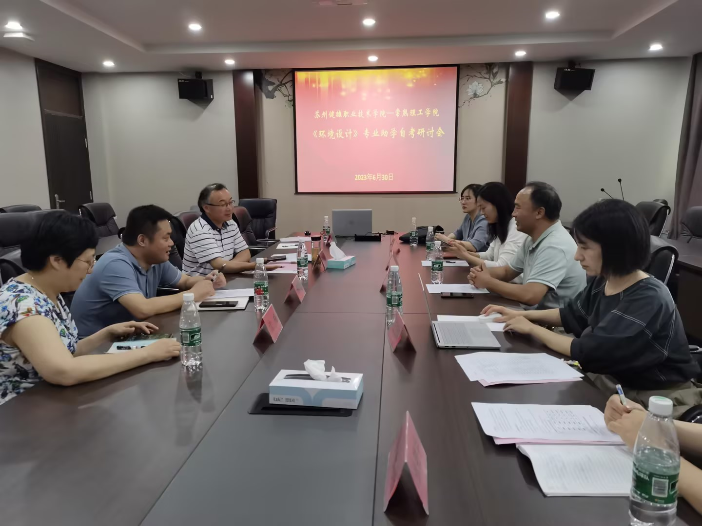 6月30日上午,我院艺术设计学院与常熟理工学院《环境设计》专业助学自考研讨会在常熟理工学院的志道楼104会议室顺利举行。常熟理工学院继续教育学院副院长周宗辉、自考办主任沈梅、纺织服装与设计学院党委书记于建忠、副院长王振伟、环境设计系主任马建梅与我校艺术设计学院党总支书记陈邦琼一行参加本次研讨。