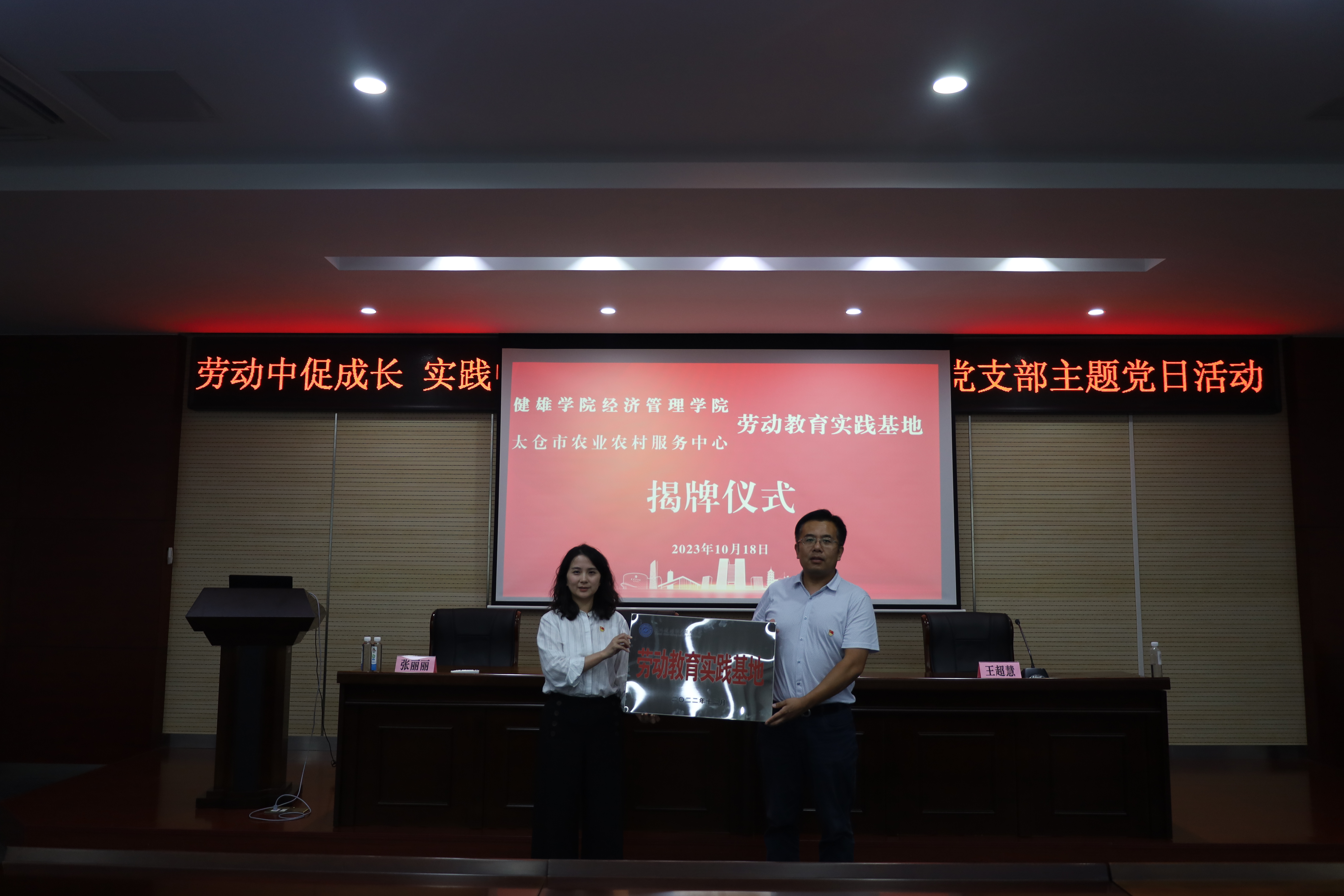 为进一步培育学生正确劳动价值观和良好劳动品质,更好地贯彻落实中共中央、国务院关于全面加强新时代大中小学劳动教育有关文件精神,10月18日,经济管理学院与太仓市农业农村科技服务中心开展共建大学生劳动教育实践基地挂牌仪式暨“劳动促成长 实践育新人”主题党日活动,经济管理学院党总支副书记沈晓婷、太仓市农业农村科技服务中心党支部书记、主任魏宗友出席活动,仪式由学生支部书记王超慧主持。