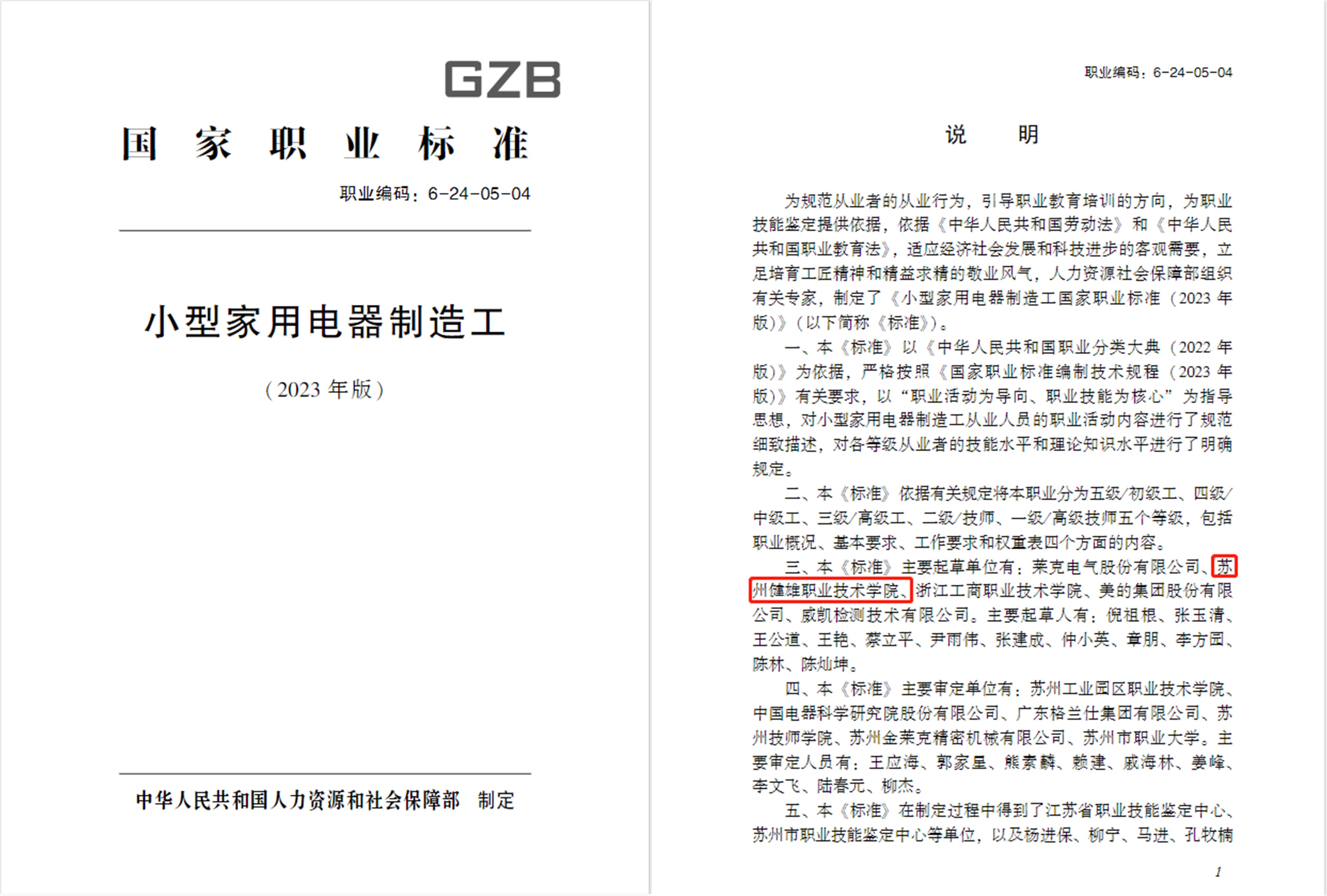 近日,我院章朋、仲小英、浦灵敏老师参与编写和审定的《电机制造工》、《小型家用电器制造工》两项国家职业技能标准通过终审,并向公众发布。据悉,两项标准均由我院合作企业苏州莱克电气股份有限公司牵头,我院三位教师作为人社厅国家职业技能标准开发专家全程参与了标准的前期准备、关键内容的制定和终稿修订工作,两项标准最终顺利通过审核和发布。