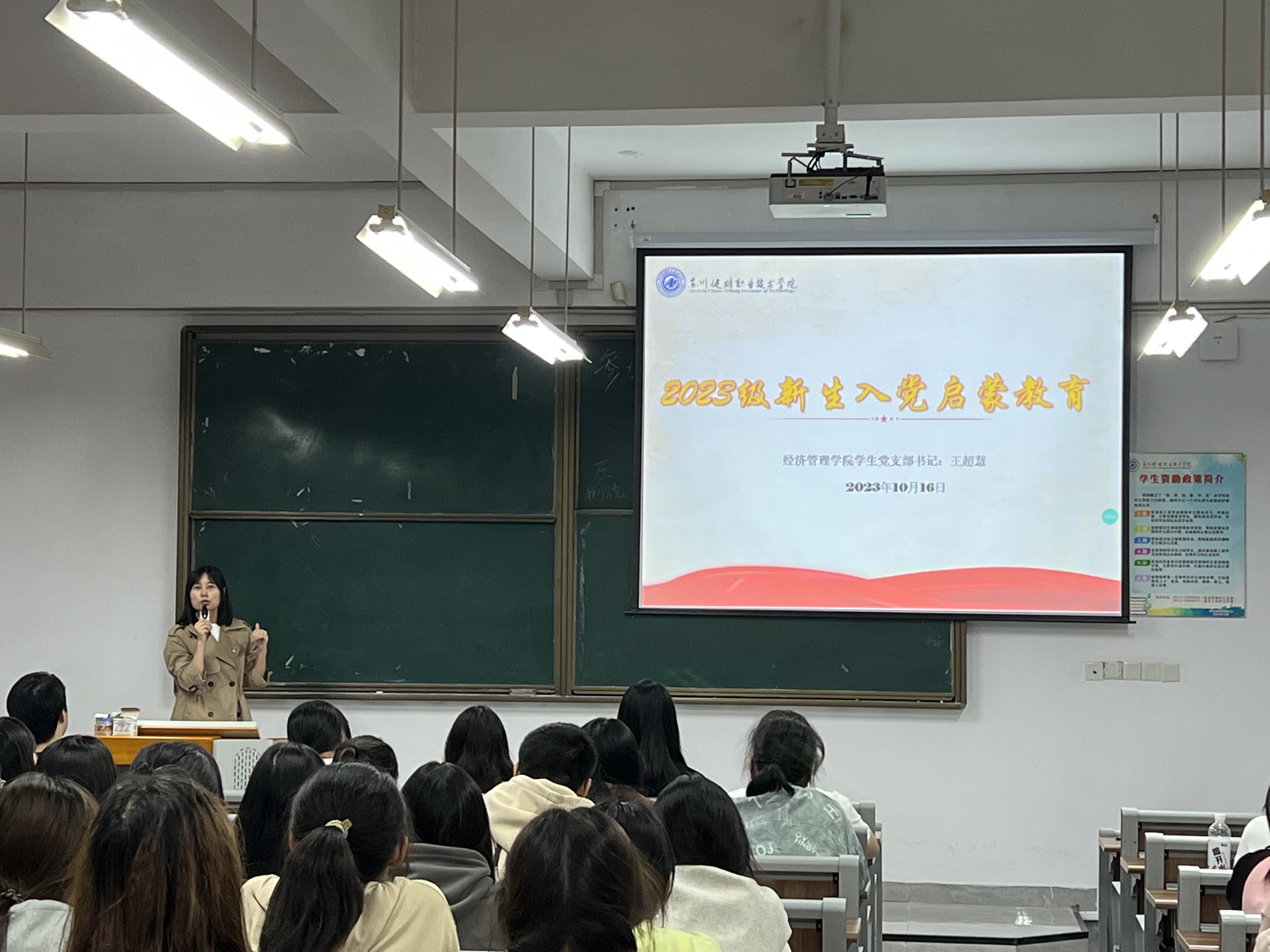经济管理学院学生党支部书记王超慧老师,围绕“中国共产党的基础知识”、“为什么入党”“如何端正入党动机”、“入党流程”四个方面来讲解,重点阐述了当代青年大学生的使命和担当、青年成长需要党的培养等方面,进一步端正学生入党动机。随后,王超慧老师介绍了青年大学生入党的基本程序,包括入党申请、积极分子考察、发展对象确定、接受预备党员和转正环节。此外,王超慧老师详细介绍了入党申请书的撰写,从格式、内容等方面对入党申请书提出严格的书写规范,为同学们提供了更加明确的指导。